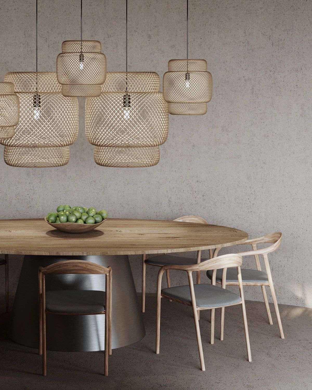 Wicker dining room pendant lights are grouped in a large composition along the length of the rustic dining table to create a show-stopping focal point and to spread even illumination. A unique modern fruit bowl serves as a rustic dining table centrepiece.