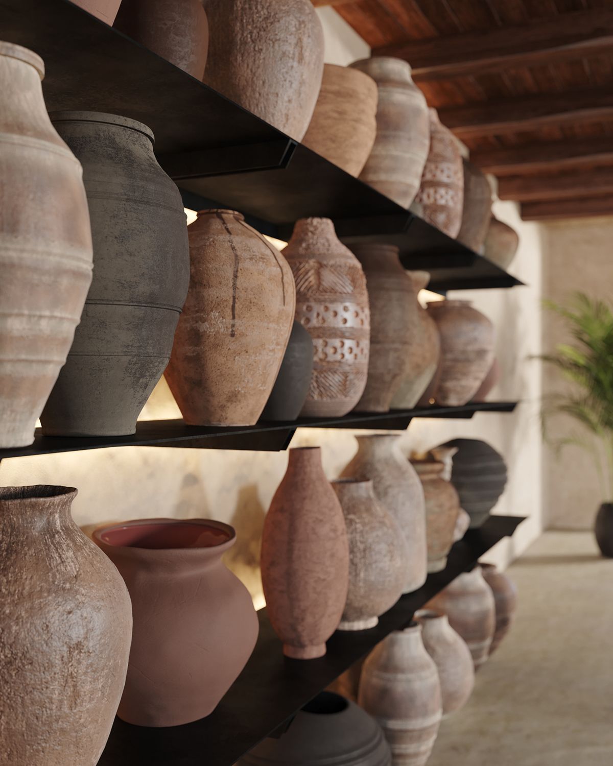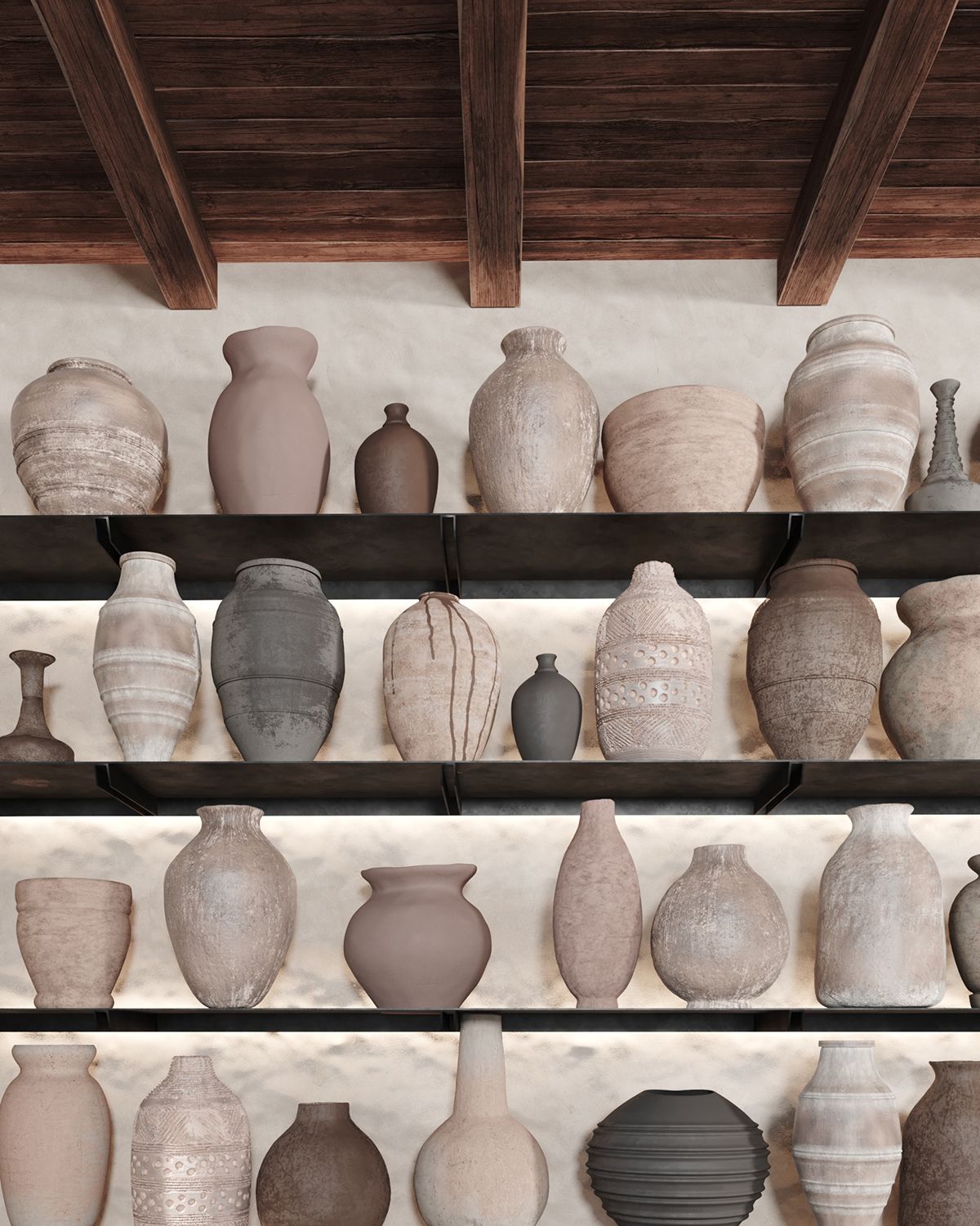 The handmade pottery is displayed over slimline black shelves and atmospherically lit by concealed LED light strips. The soft glow not only accentuates the handcrafted vases but highlights the rustic wall texture too.