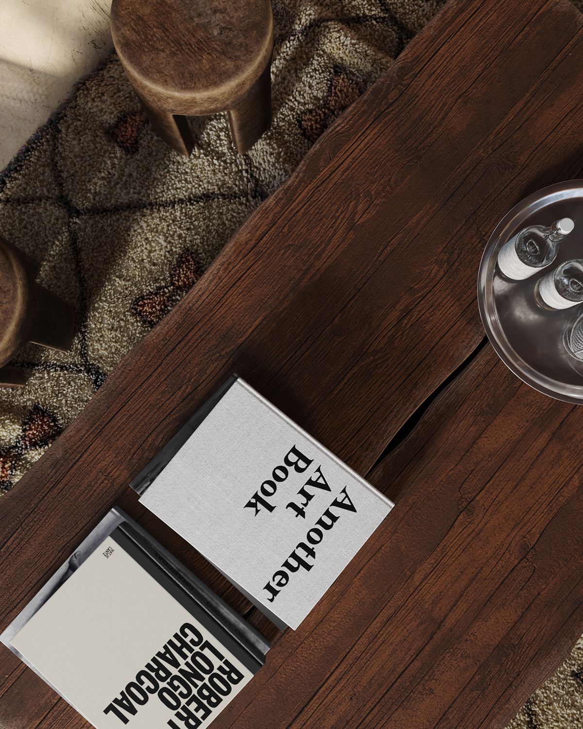 A collection of coffee table books add a modern touch to the living room decor scheme.