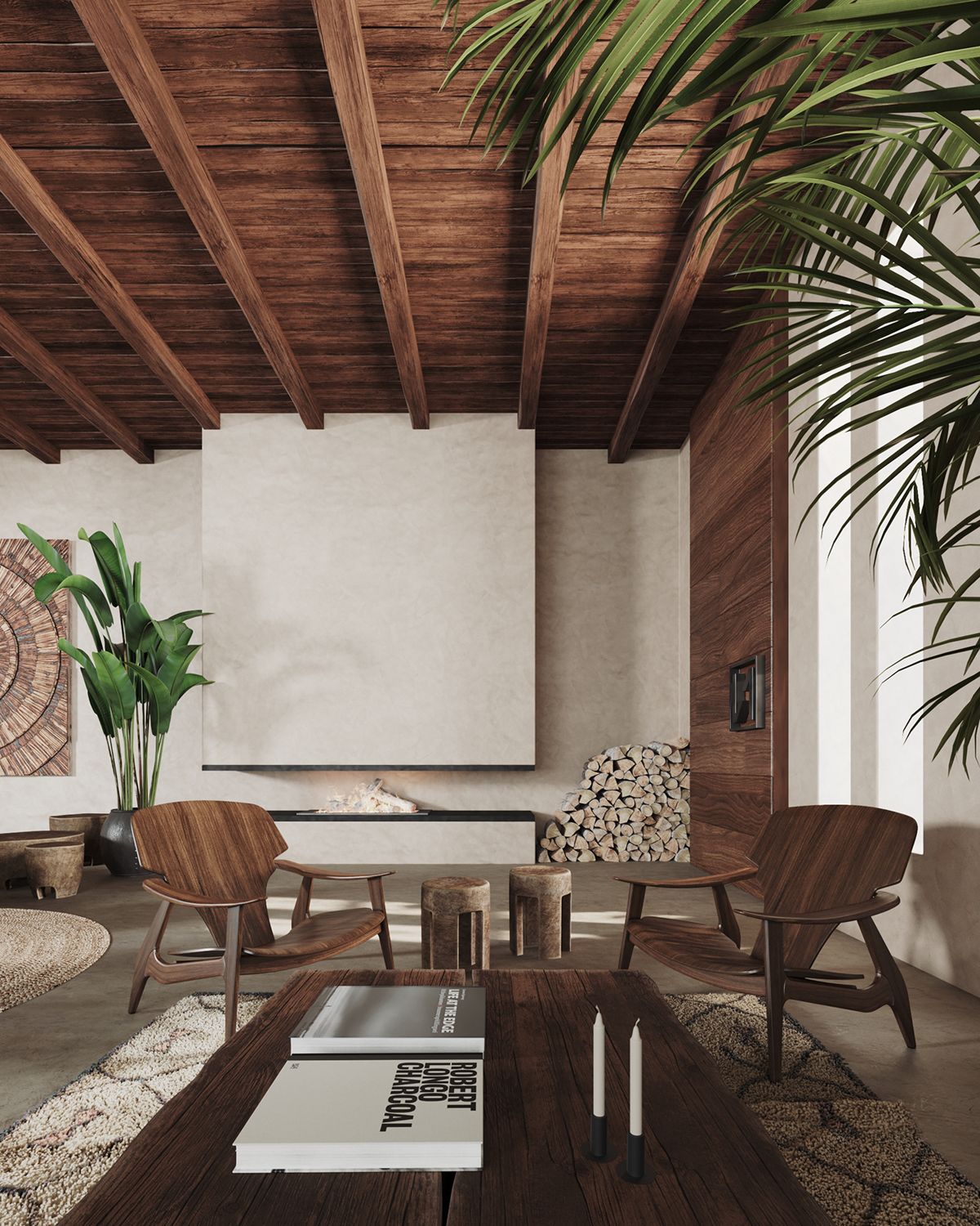 A rich, dark wood ceiling treatment caps the light room decor. A wooden chair set perfectly complements the tone.