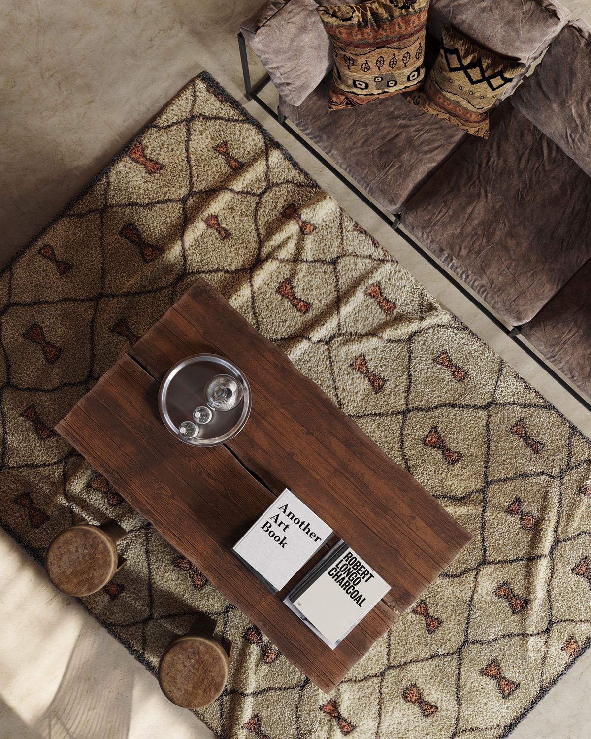 In the centre of the lounge, a rustic wooden coffee table is teamed with a couple of small stools.