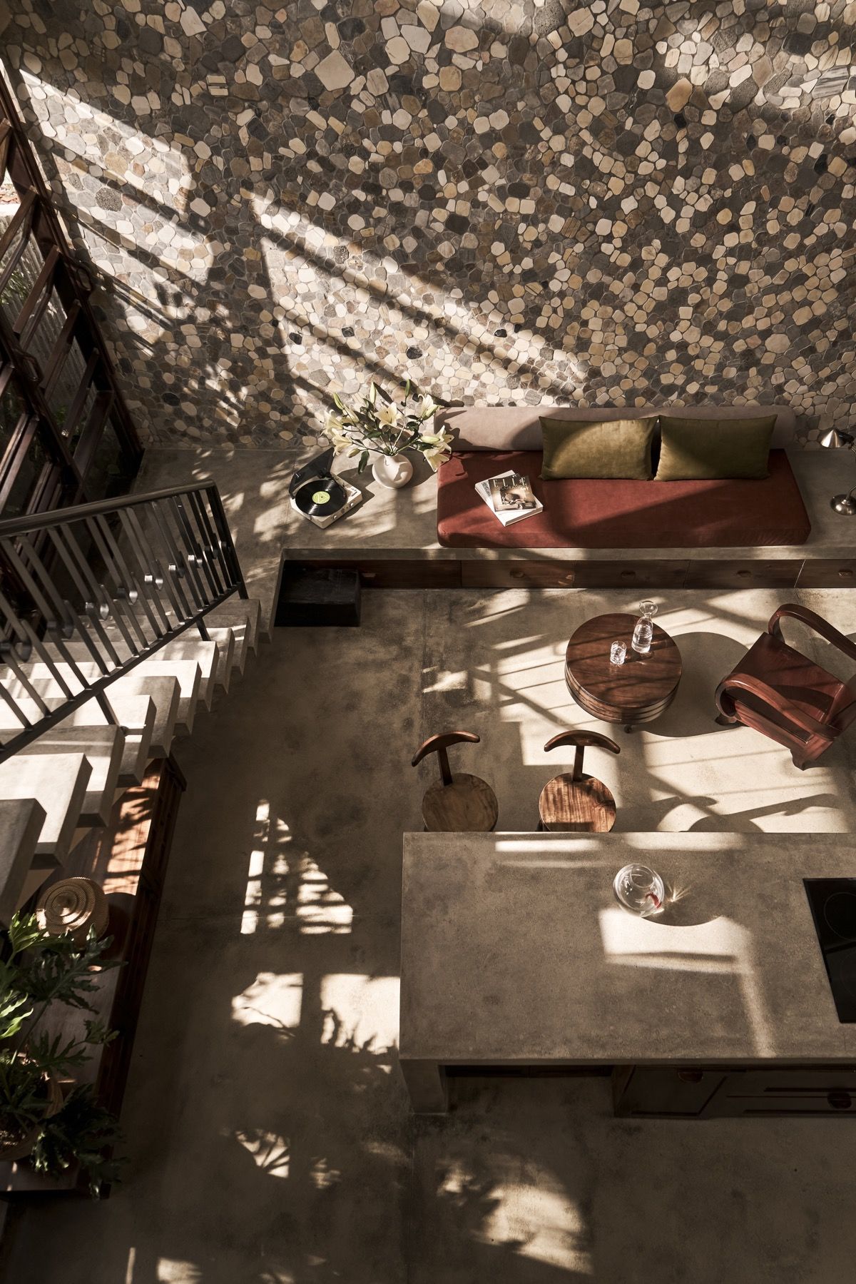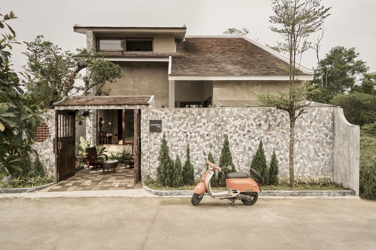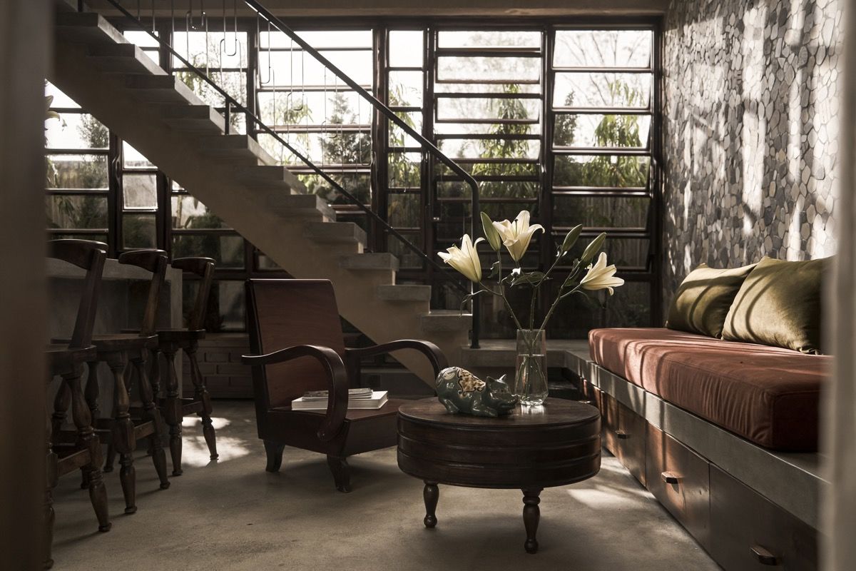 Although Hue is one of the biggest cities in Vietnam, the lifestyle is very peaceful. This calm spirit is conveyed in a traditional home exterior where rustic stone walls attractively encase a welcoming courtyard. Local to Hue city, an ancient style of plain clay roof tiles, called “Liệt” tiles, give the home exterior its traditional crowning. A modest fenestration of glass louvre windows interrupts a warm, sandy-coloured render.
