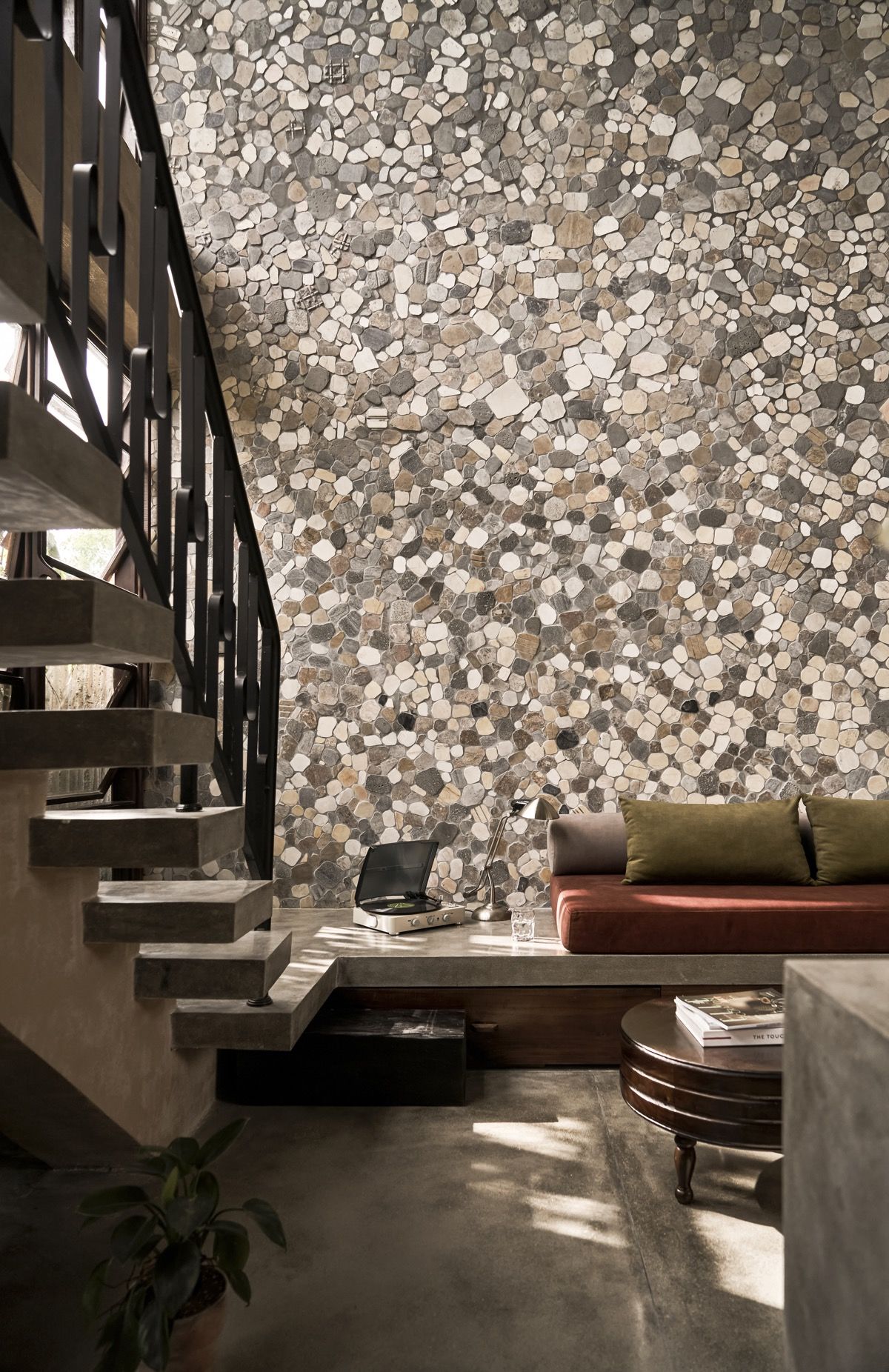 The house interior is light-filled with a rustic indoor-outdoor appeal. A great stone feature wall climbs the double-height living space, creating natural tonal beauty that invites the eye to wander up to lofty heights.