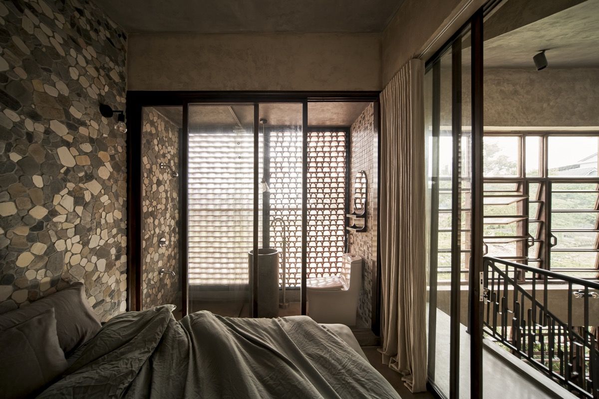 Upstairs in the mezzanine bedroom, the stone headboard feature wall continues seamlessly into the ensuite bathroom design, which is separated by a clear glass wall. The glazed wall admits natural light into the room and increases visual space. The daylight filters through an eye-catching terracotta block bathroom wall that creates a pattern of arches.
