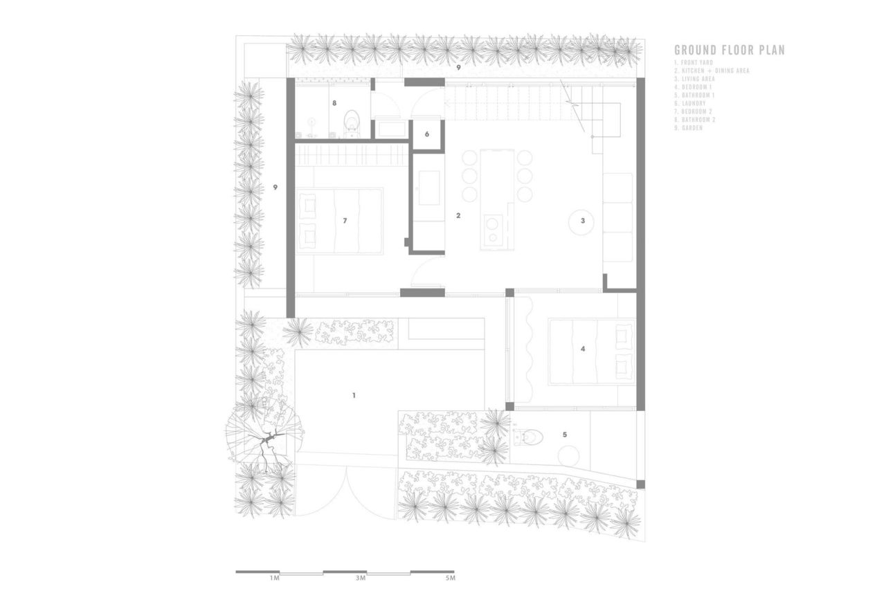Ground floor plan, showing the compact open plan living space with kitchen and dining areas, plus two bedrooms and two bathrooms. The courtyard design behind the fence gate was designed to promote an intimate atmosphere that would evoke memories of childhood for the retired couple. Reclaimed plain clay tiles and blocks of baked bricks were assembled to draw parallels with traditional houses in the countryside, and paint a restful palette of earthy brown tones.