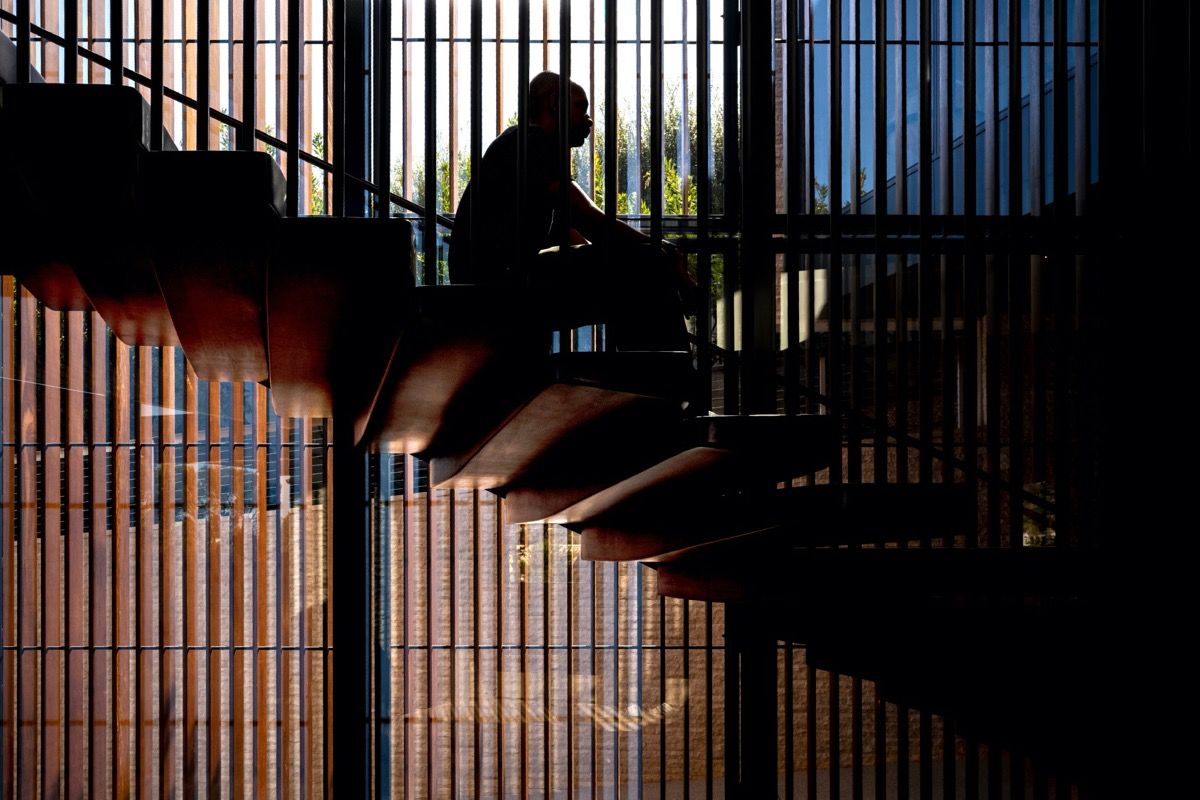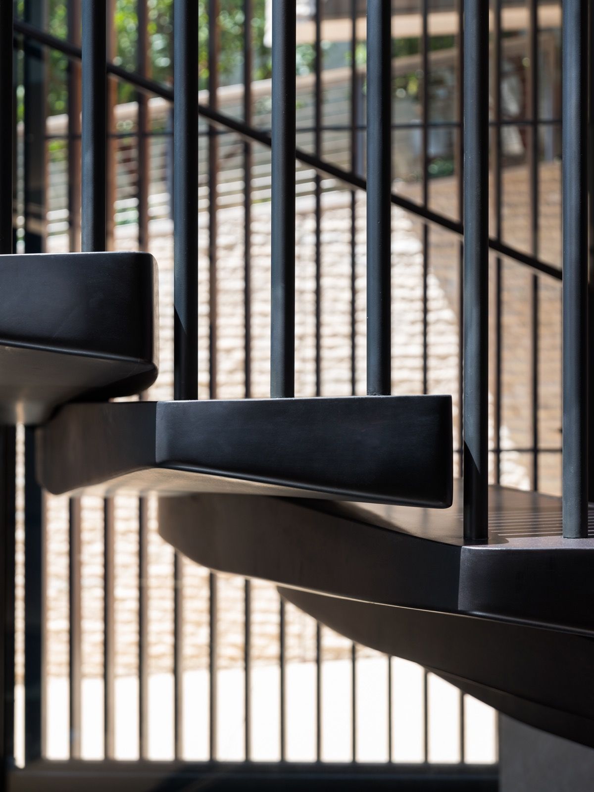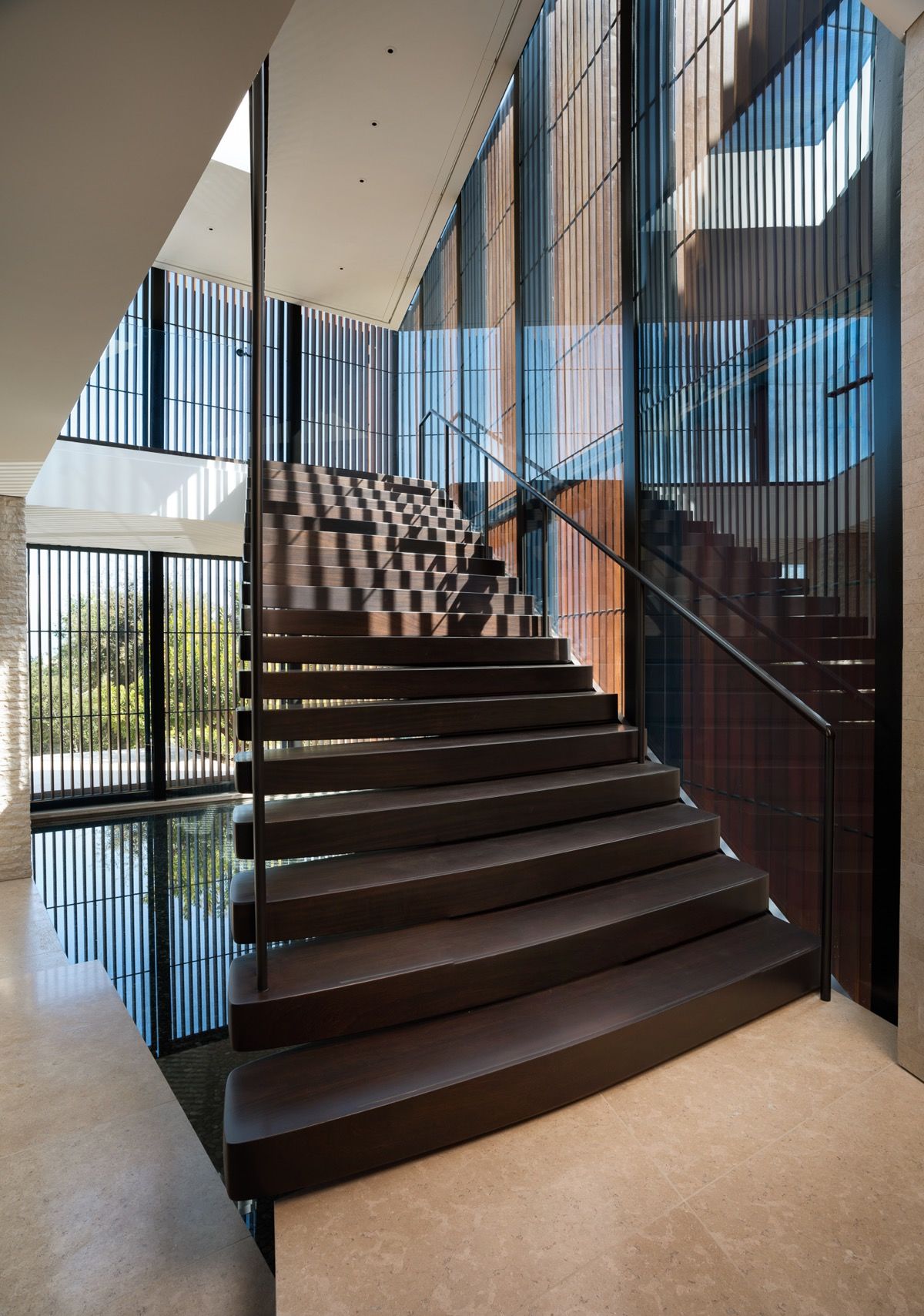 Slender and dark, the silhouette of the main staircase merges easily with the dark slats outside.