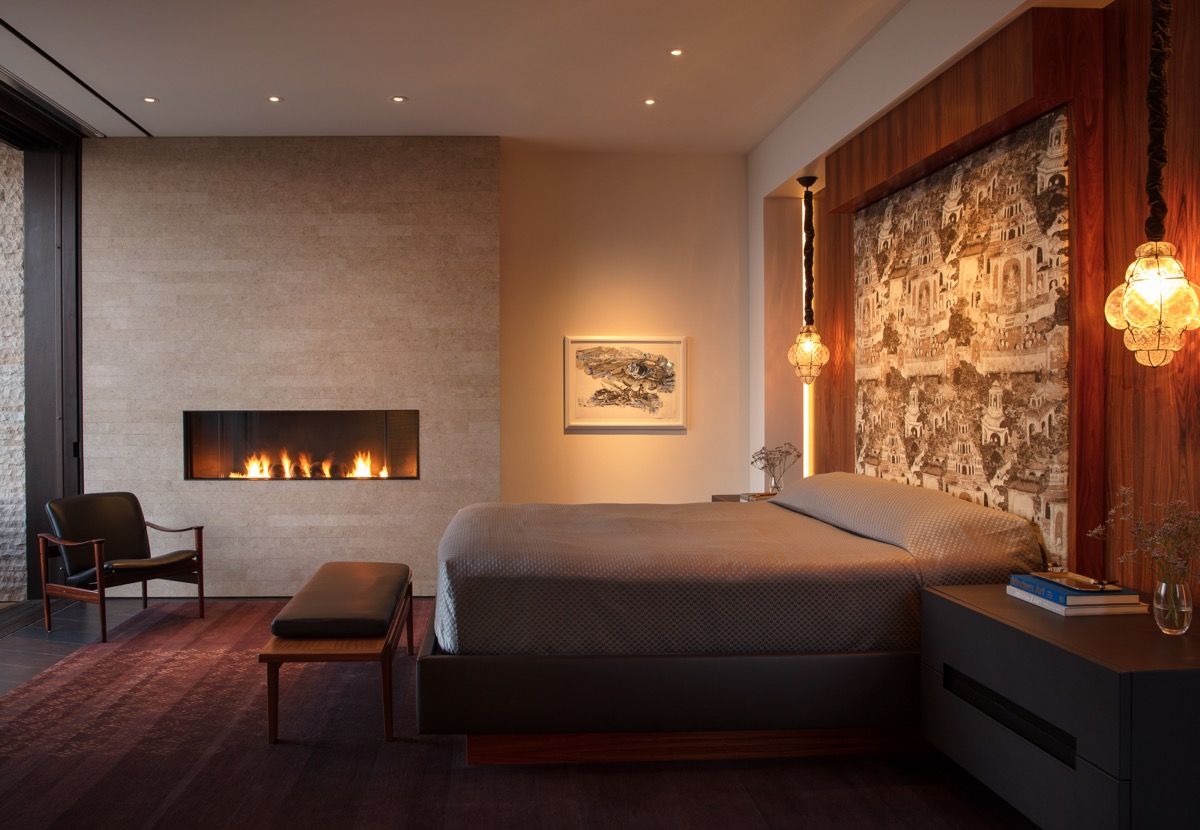 The bedroom has a mood all of its own, with a roaring modern fireplace and lantern style bedroom pendant lights. The furniture is kept simple with a clean cut platform bed, contemporary bedsides, a sleek end of bed bench and matching chair.