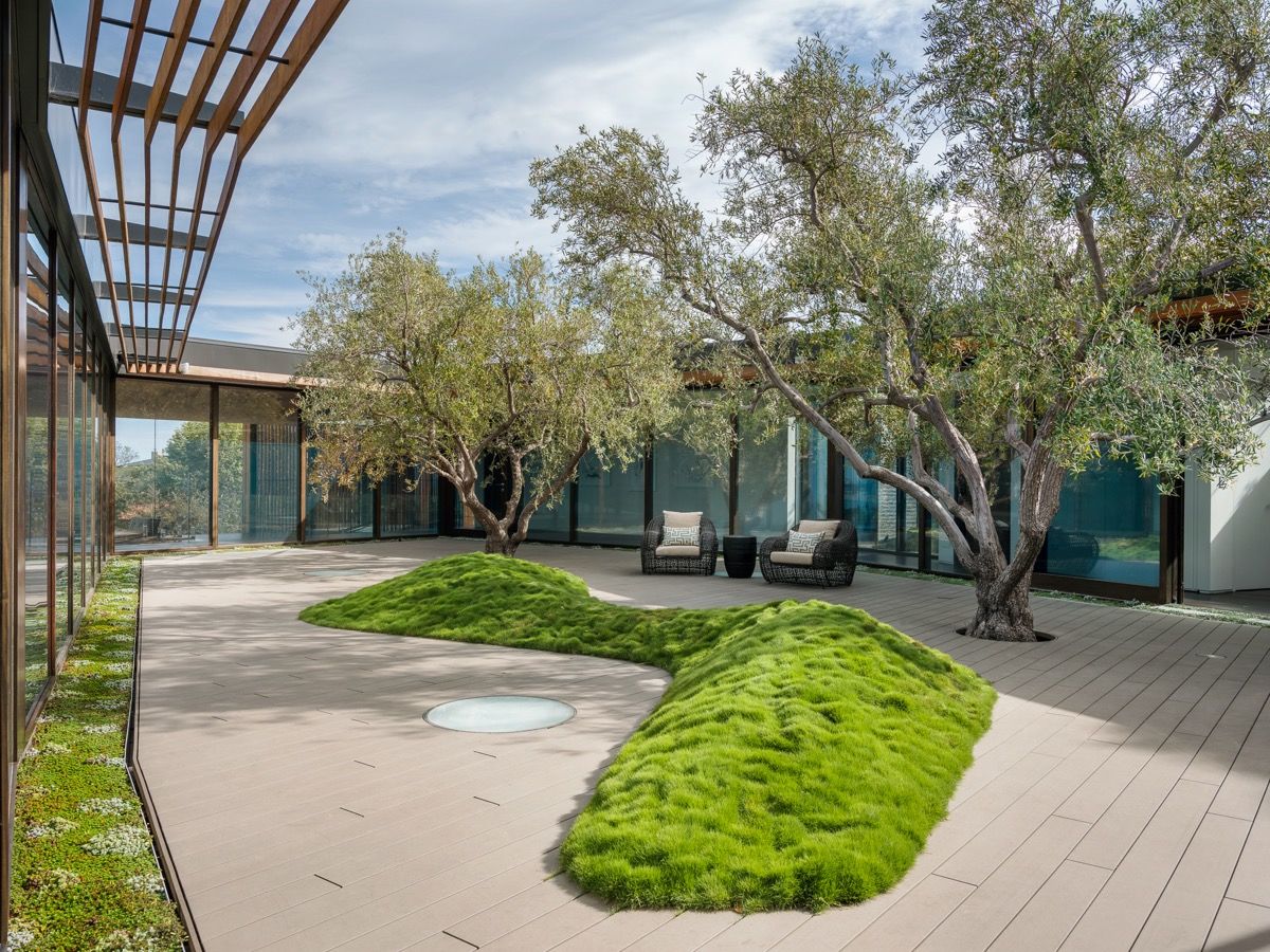 Courtyard treetops peep through the top of the luxury home to visit with the sun.