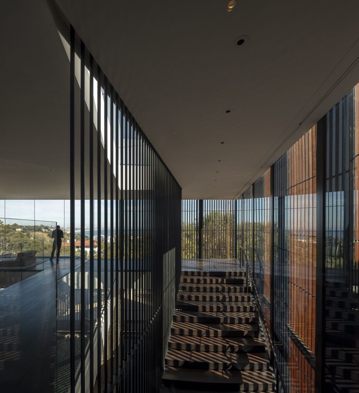 The staircase design, mezzanine and bridge triangulate the journey over the reflecting pool, balancing out the building’s geometry.