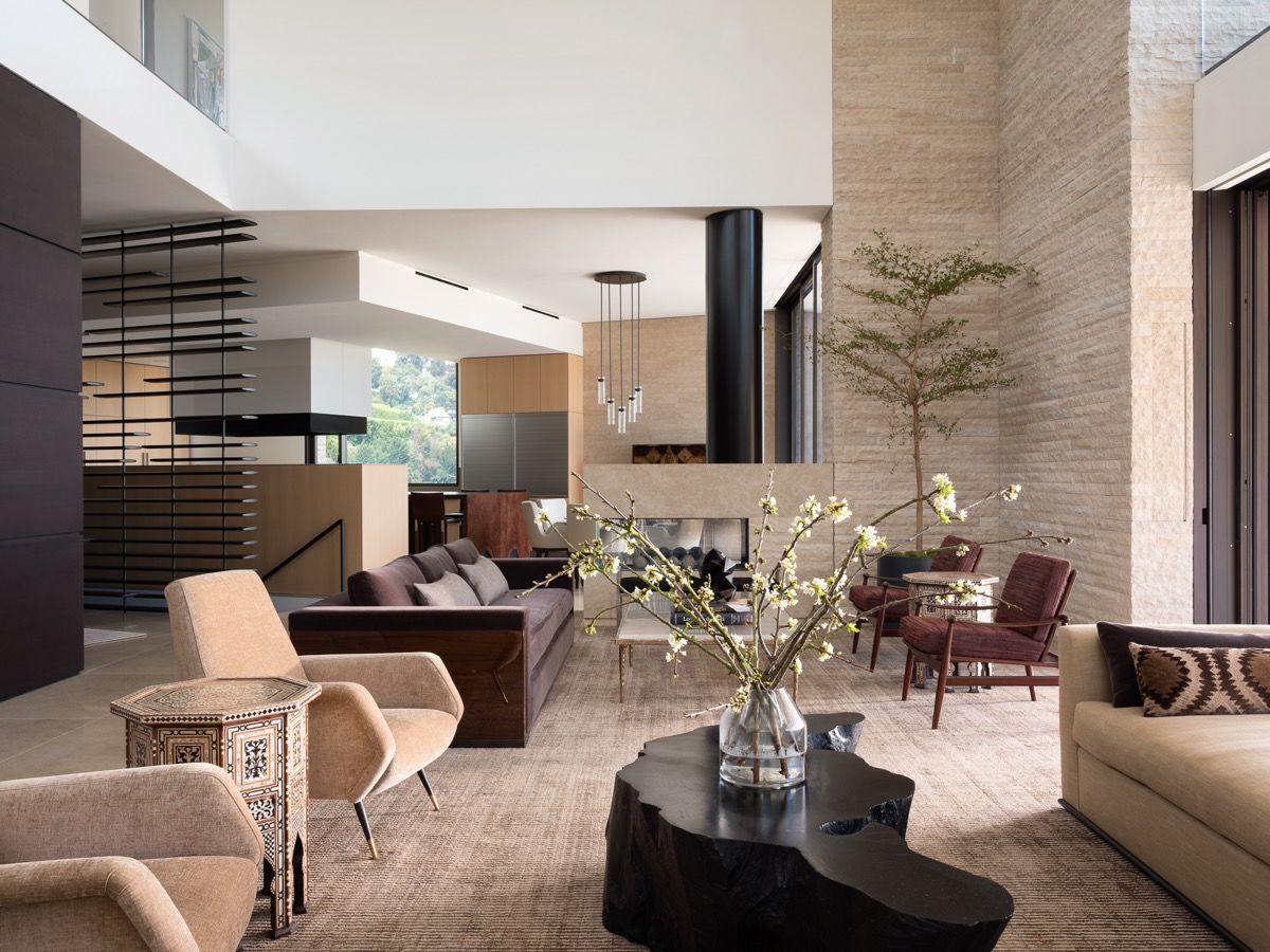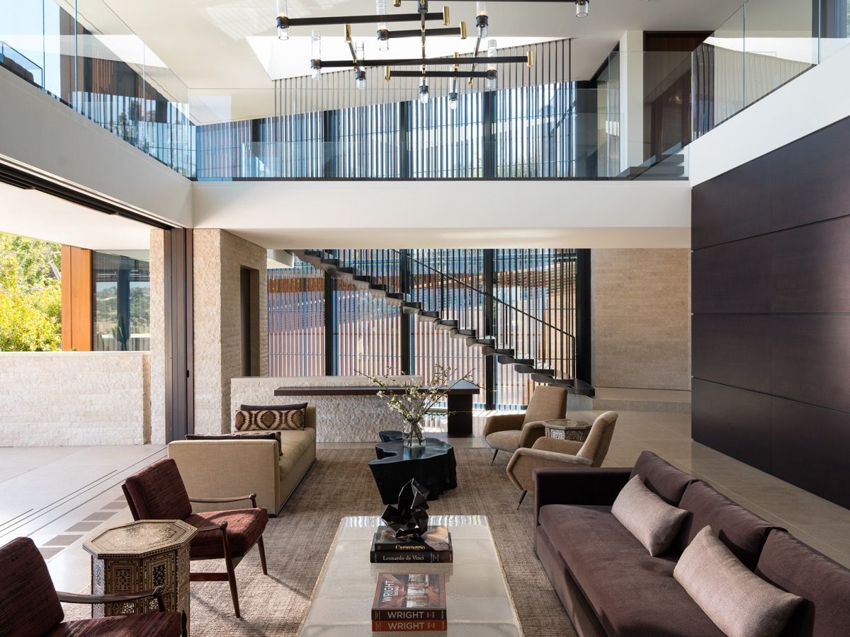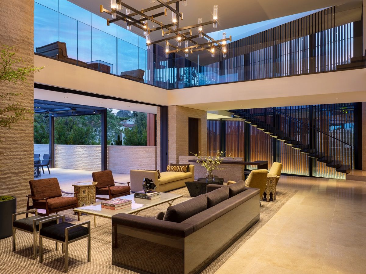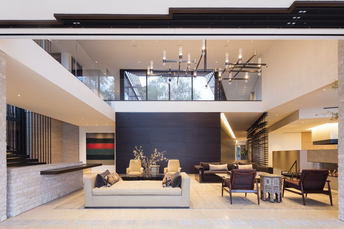 As we move inside the impressive LA home, a modern chandelier draws the eye up to appreciate the double height grandeur of the stylish living room.