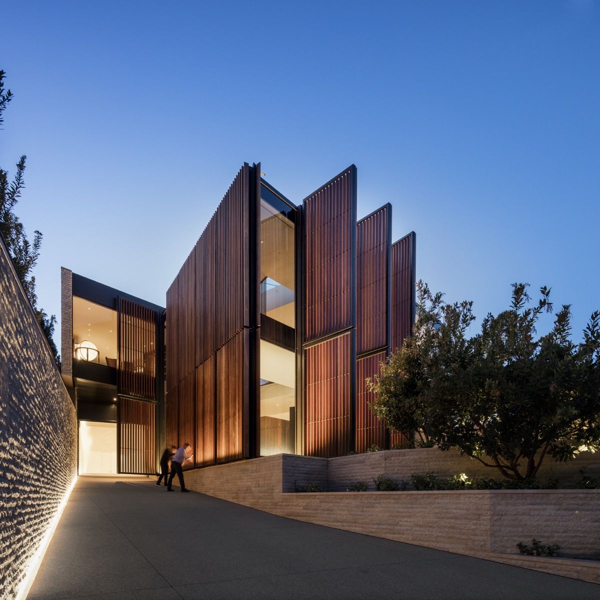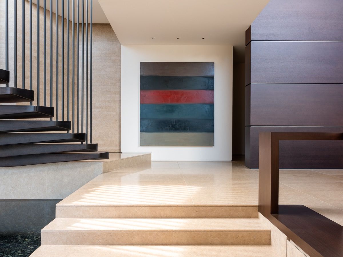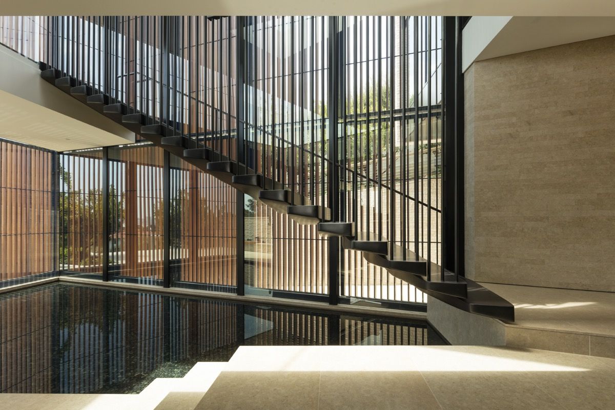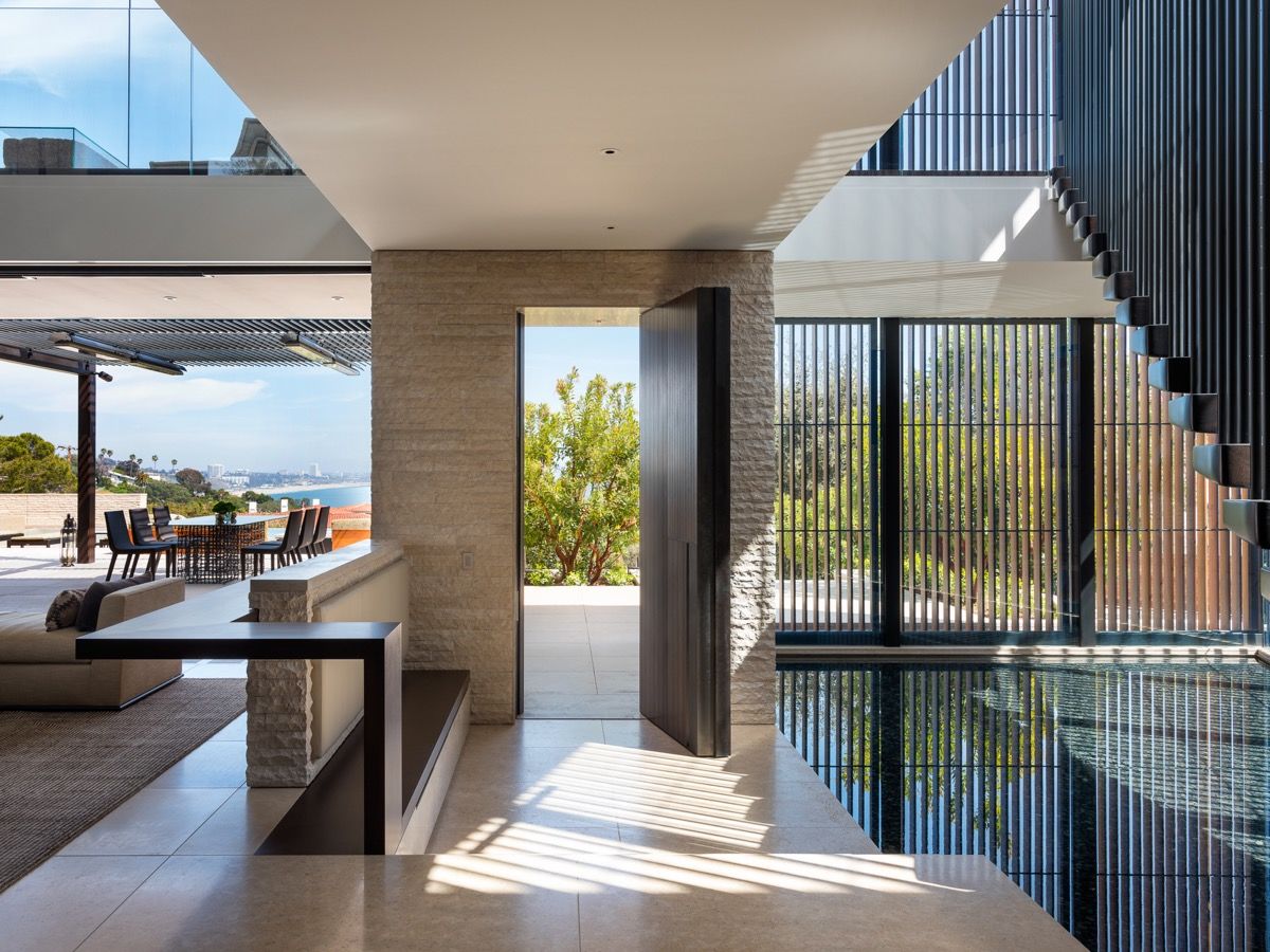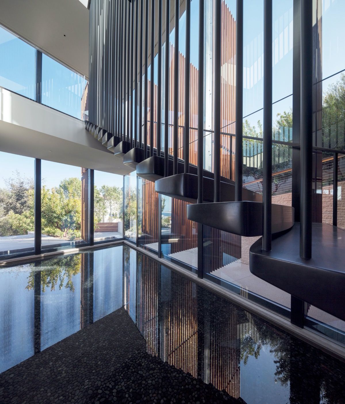 A heavy pivoting front door makes a lasting first impression. A reflecting pool doubles the effect of a feature staircase overhead, and towering shutters outside the glass.