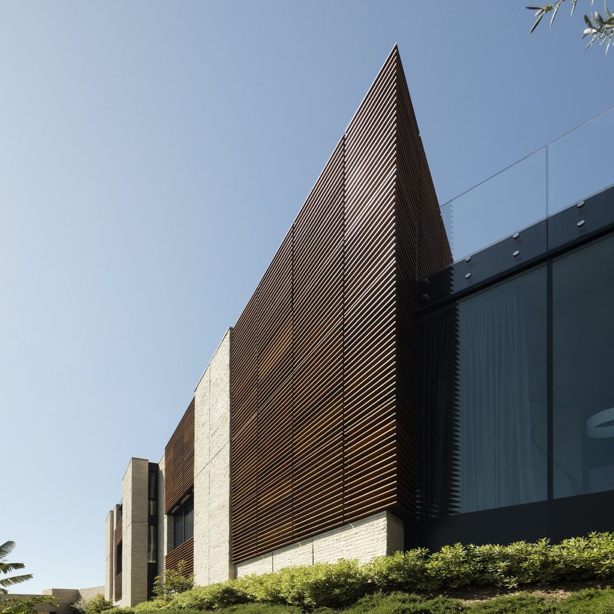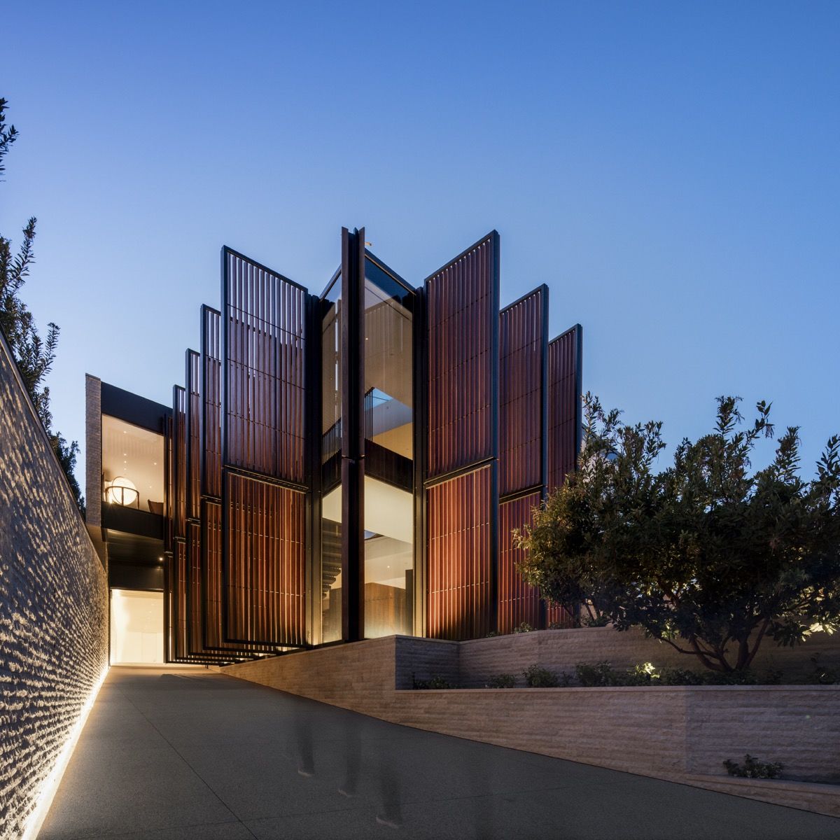 Enormous wood shutters encase the two story facade, emphasizing its vertical height. The extraordinary window shutters screen off glass walled private quarters from the public approach.