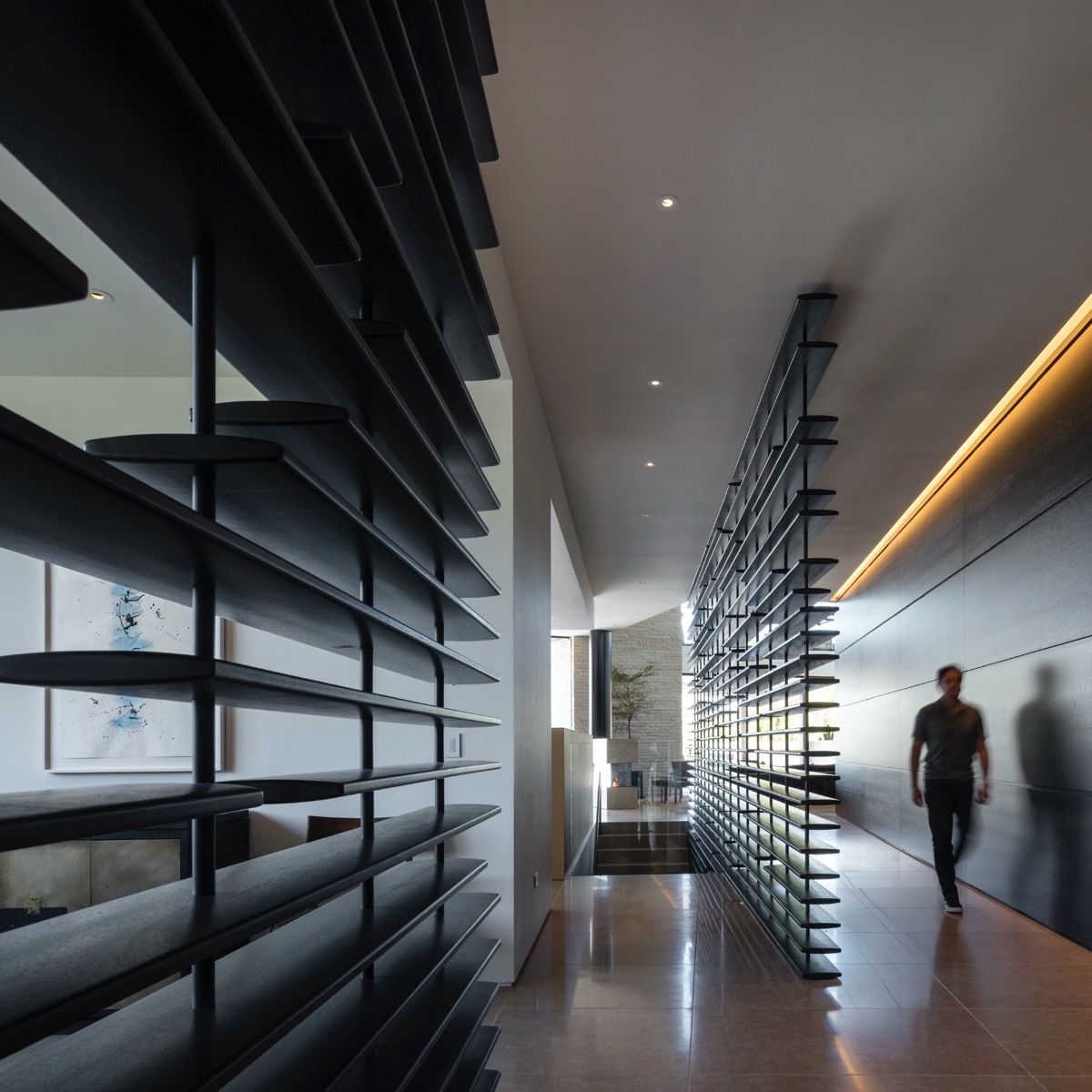 The dark shutter aesthetic translates horizontally into room dividers inside the home.