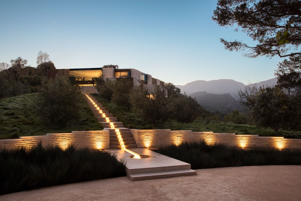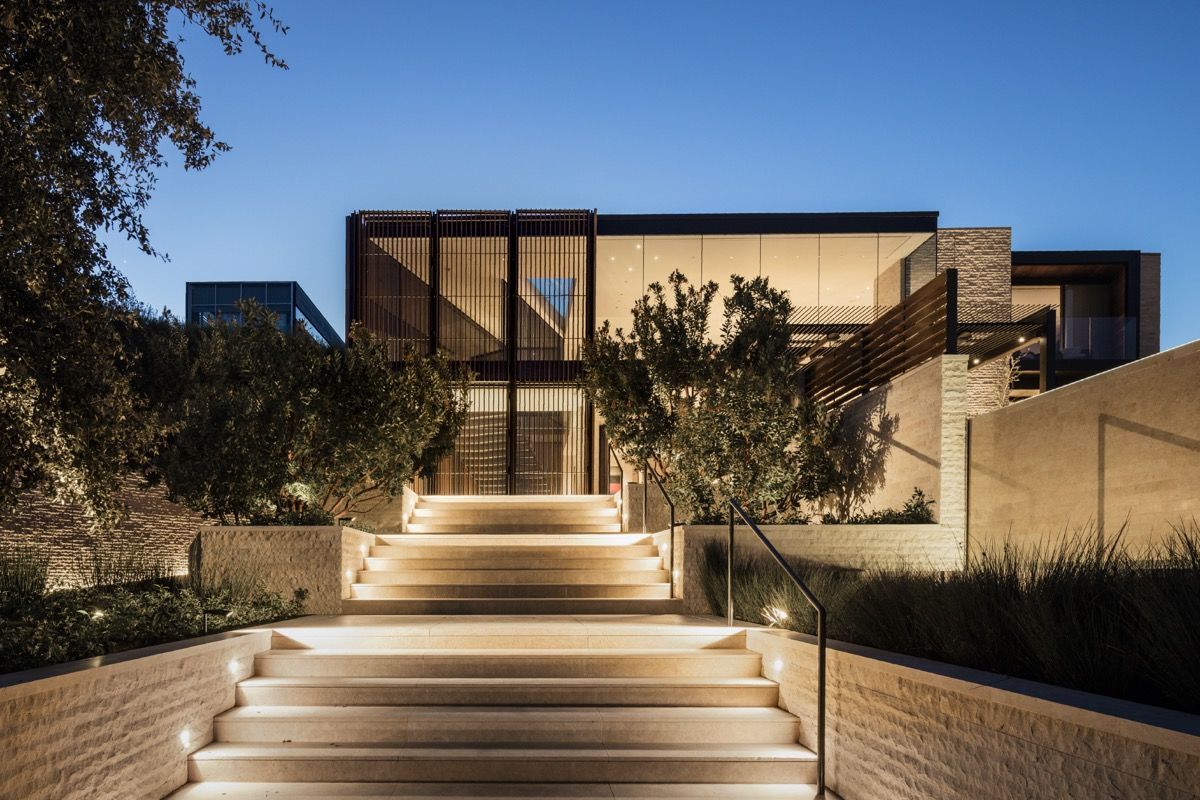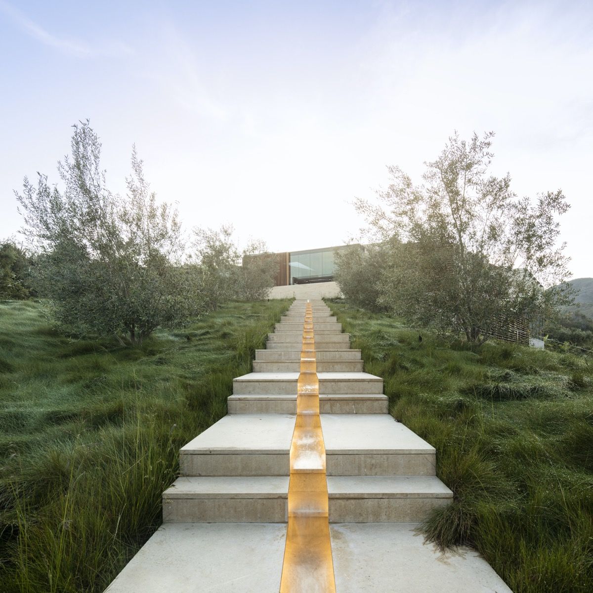 The approach to the home cleanly navigates the challenging landscape; the seemingly endless staircase is cut through by a blaze of light that flows like a river of lava. More lights set a stone wall ablaze at the bottom of the feature to expand and dramatise the point of arrival. A horizon of mountains compete with the mesmerising house for dominance.