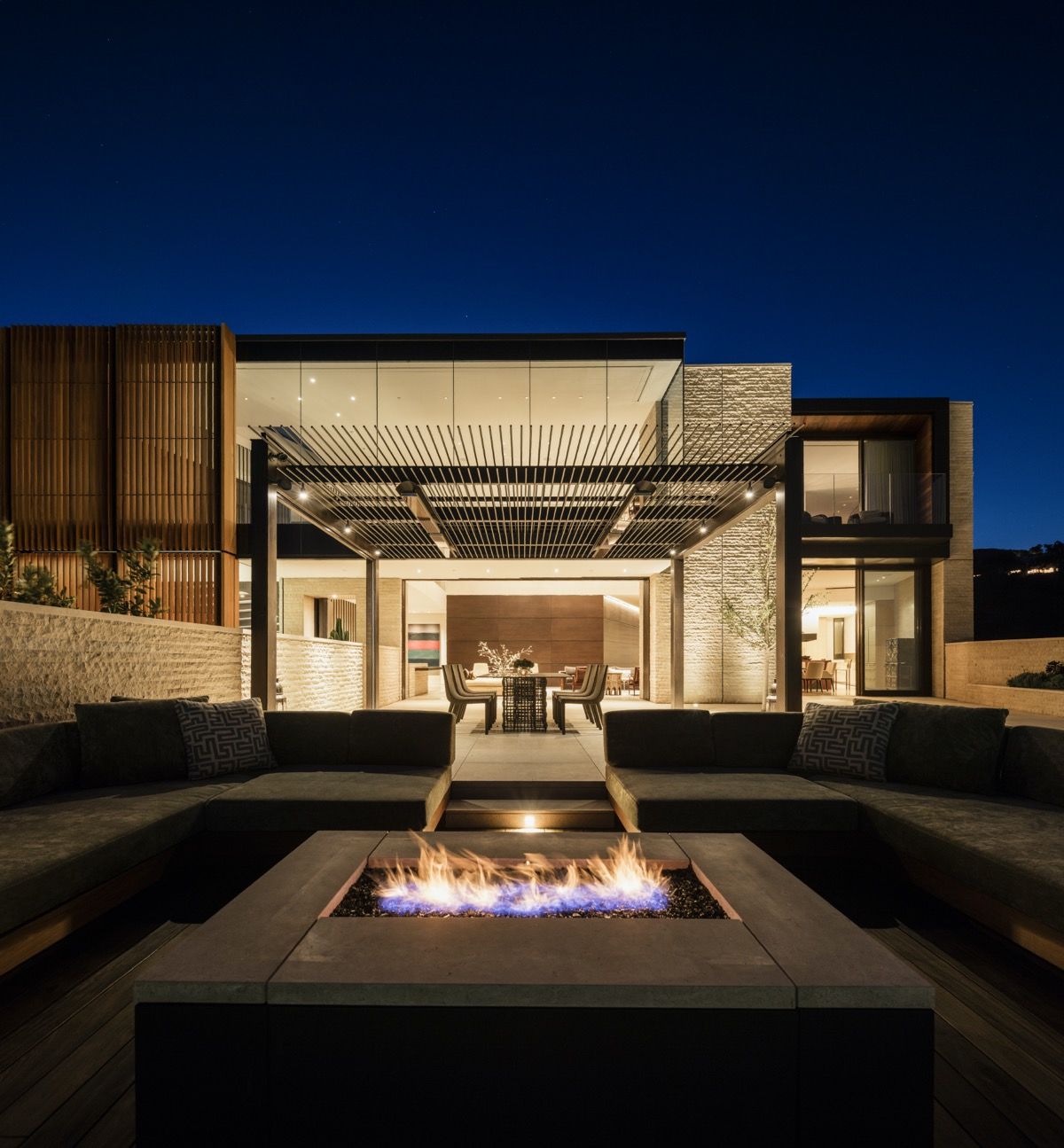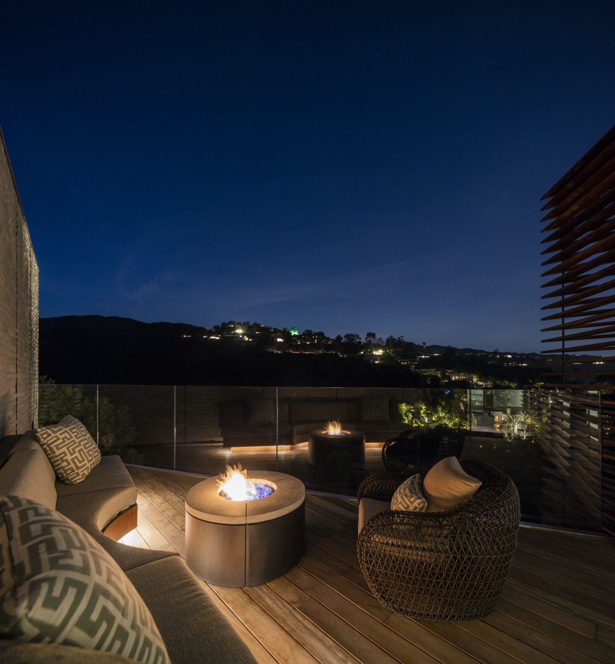 Downstairs on the main terrace, a central fireplace draws everyone to gather around the conversation pit.