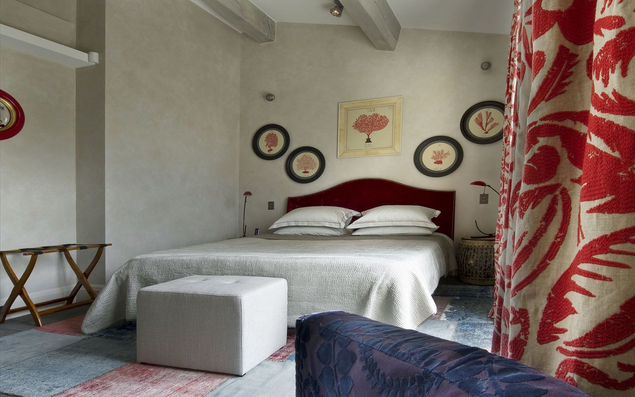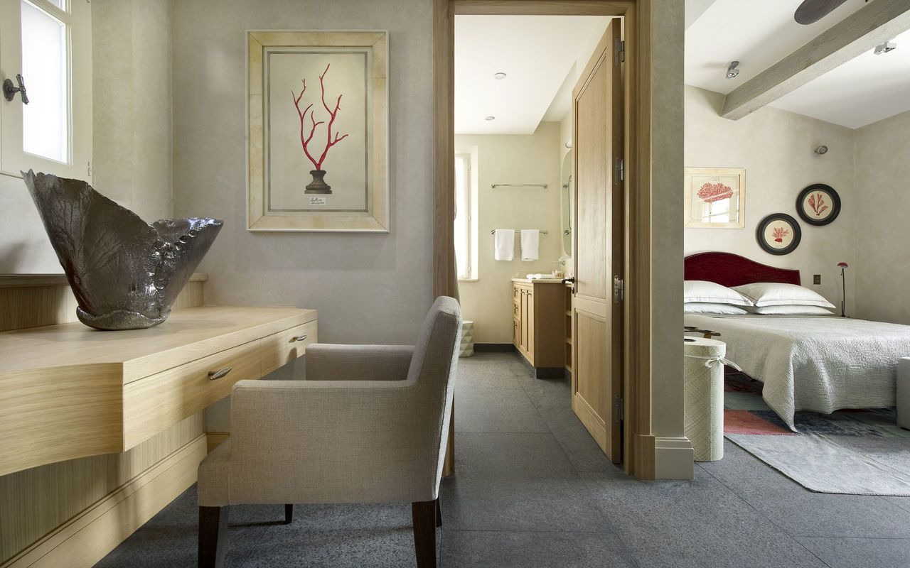 The red accents move through the bedrooms and shedding their nautical chic, take on a warmth inspired by objects of the natural world and the sea itself. The red settles in the muted tranquility of a seafoam green color scheme offset by painted and exposed beams treated to appear not unlike driftwood. Red accents all but dissipate in each of the four bedroom’s en-suites, the master’s double beginning a new, altogether cooler palette in it’s black and white floral prints, that is seen again in the minimalist kitchen and open internal spaces.