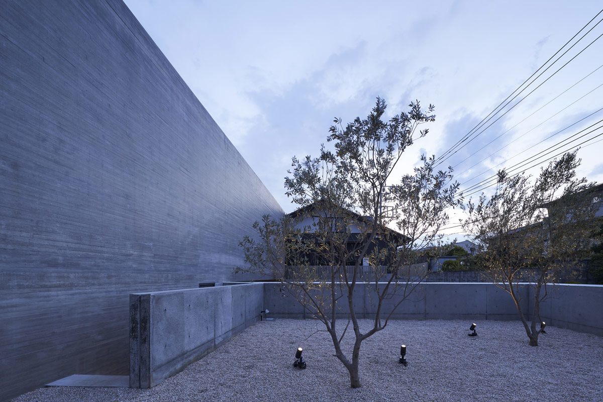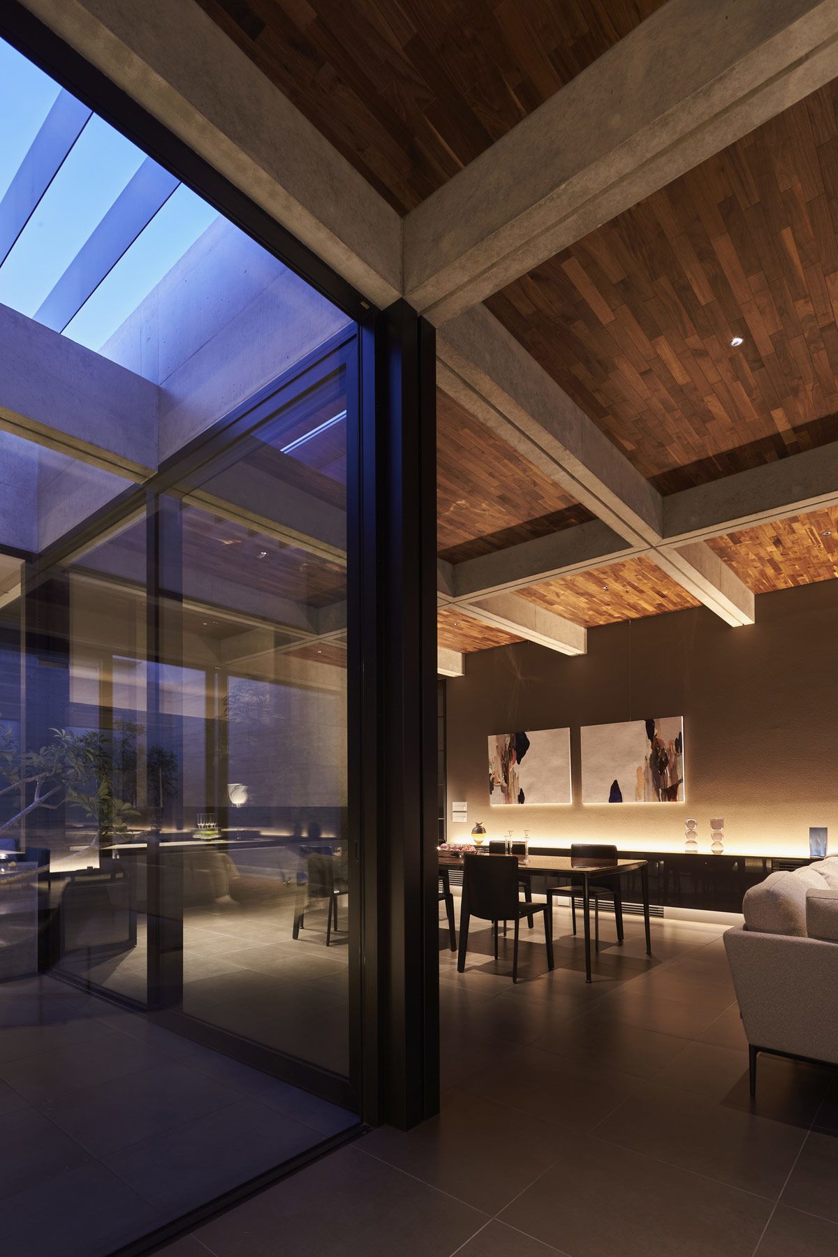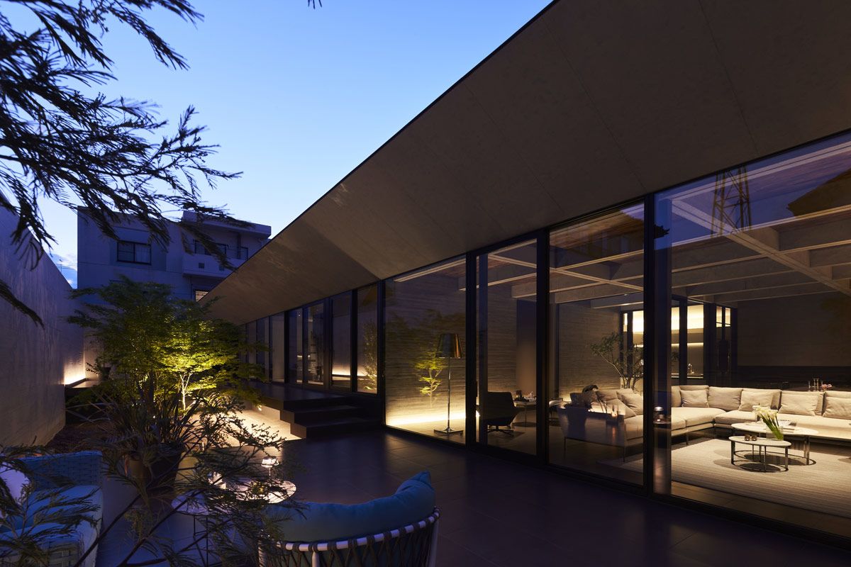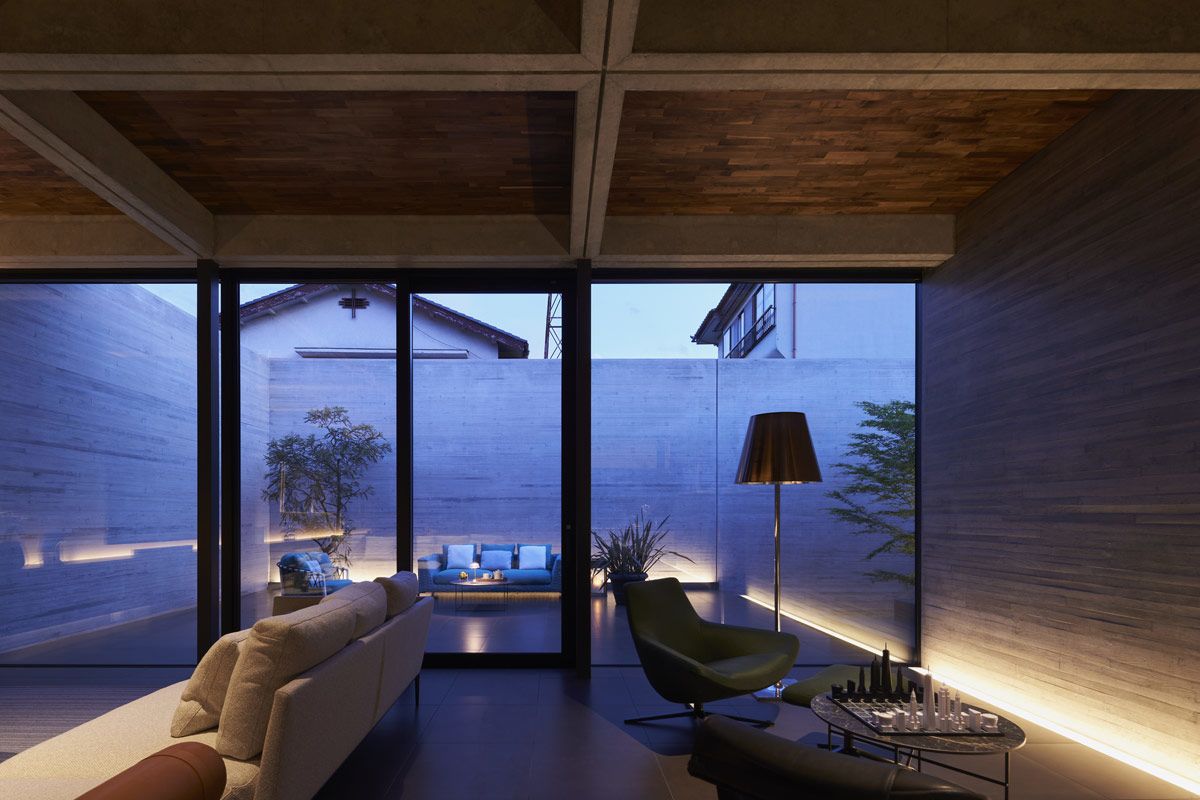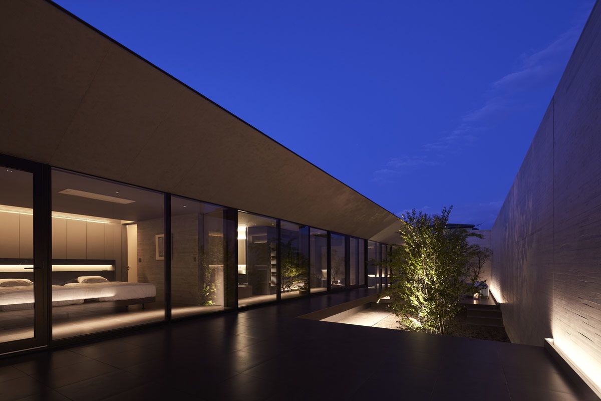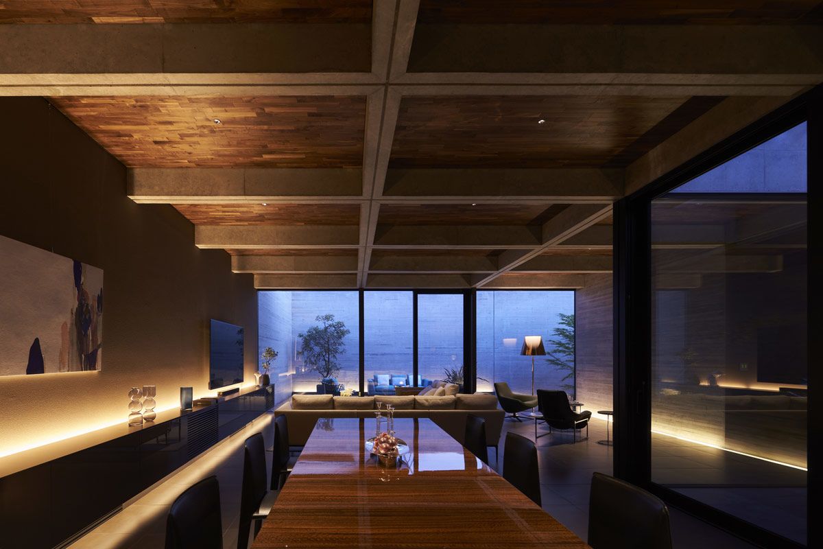 The board-formed concrete walls create a textural consistency around each of the outdoor spaces, which is picked up gently in the ambient light.