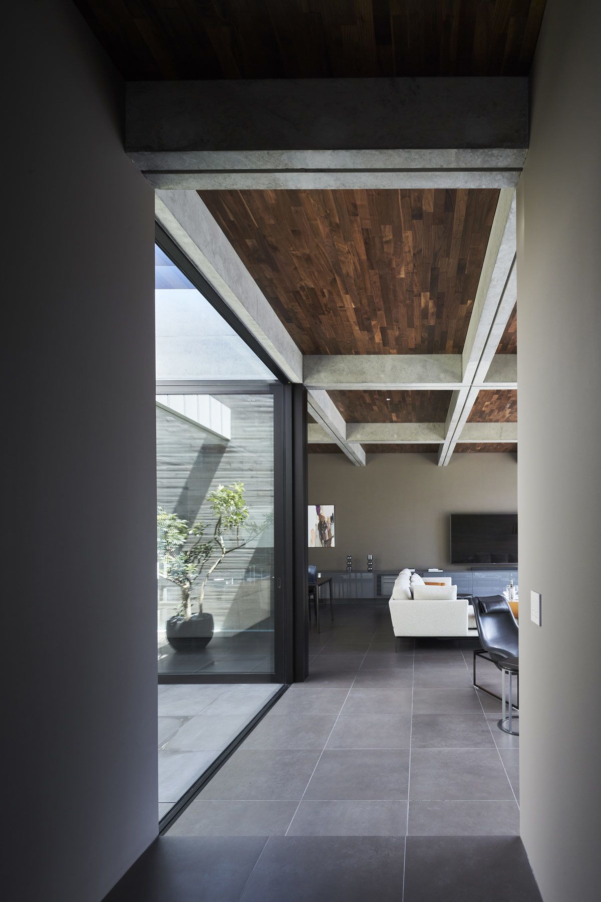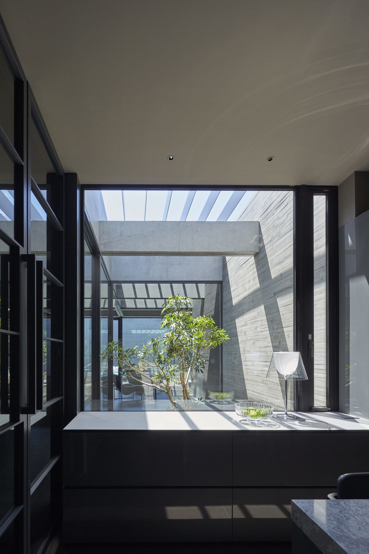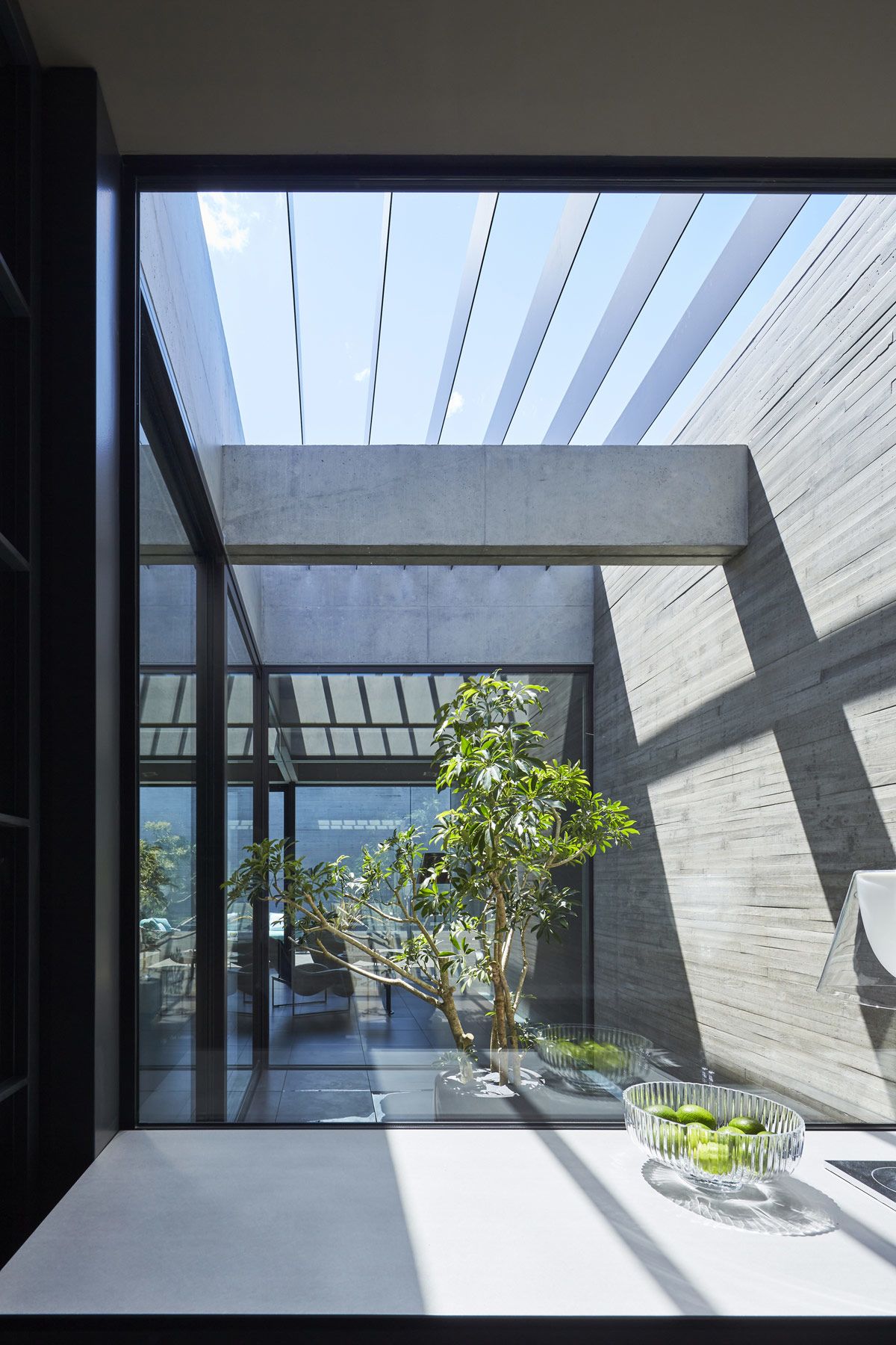 A pergola overlay creates light play across the small courtyard between the living room and kitchen.