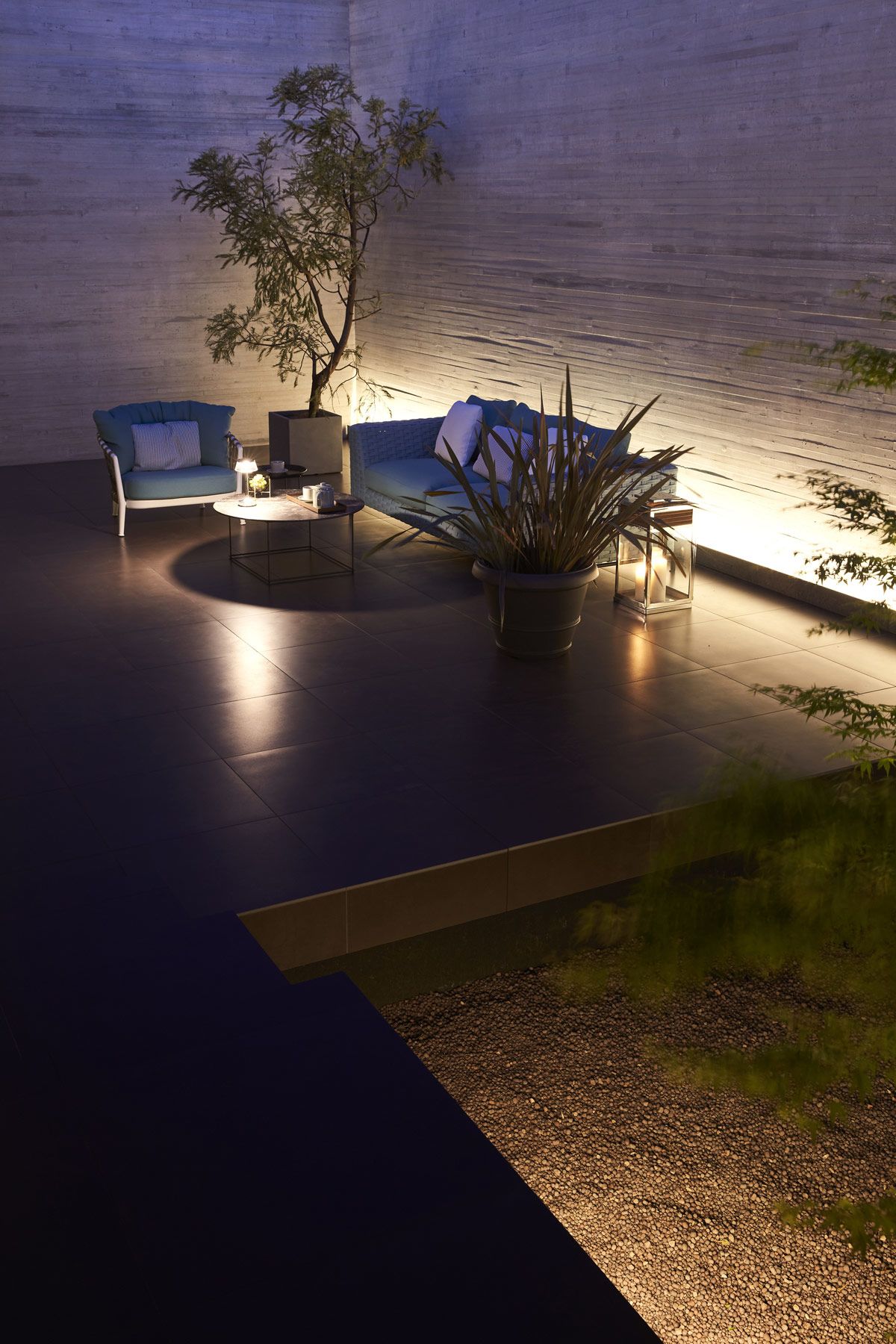 Small trees bed into the roof terrace. Uplights highlight their fine branches in the dusk.