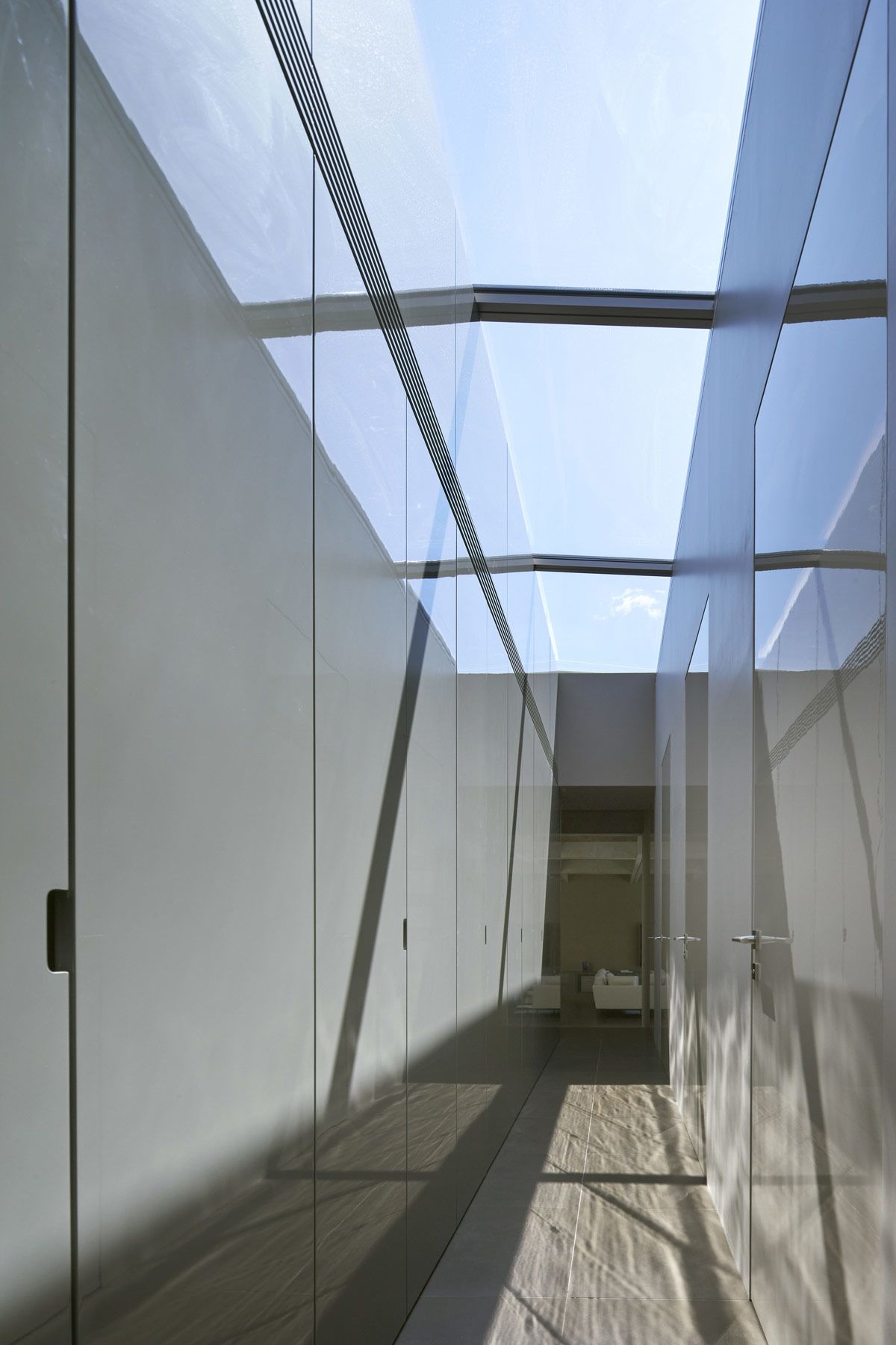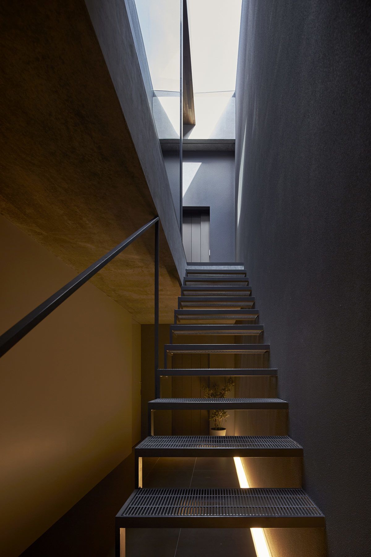 A modern metal staircase design climbs from the parking garage to the living space beneath a long skylight. Access to the elevator is located just beyond the treads.