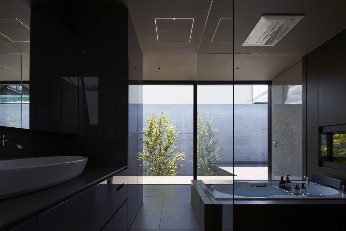 The bathroom is a luxurious space, with an edge-to-edge view of the very private terrace garden on the south side. Black gloss cabinets build a storage packed vanity area.
