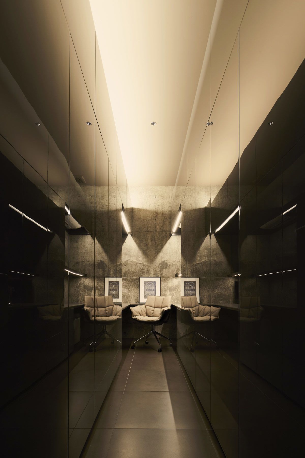 Another strip of LEDs marks the top of the bespoke cabinets that connect the two living spaces.