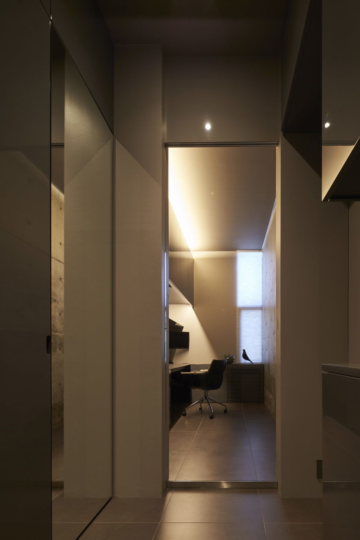A second home workspace features a bespoke L-shaped desk built into small quarters. An Eames bird oversees productivity from the window.