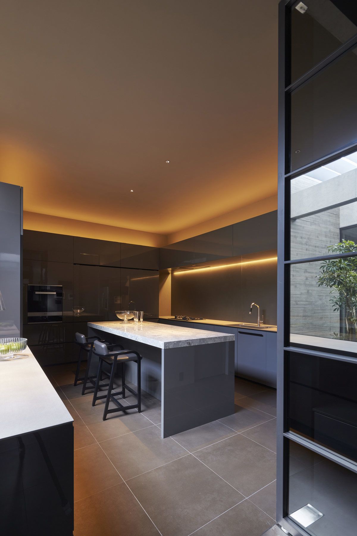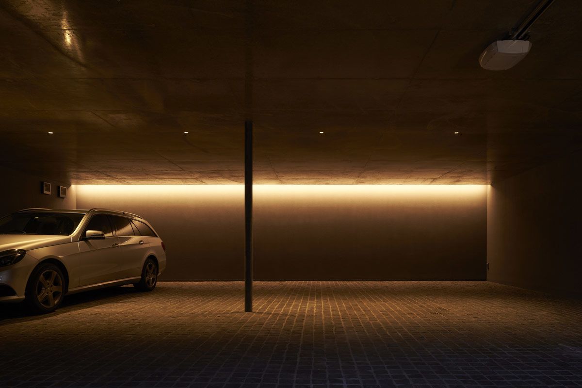 LED ribbons are set around the perimeter of the room, causing a glow at floor level that continues out into the walled garden in one seamless sweep.