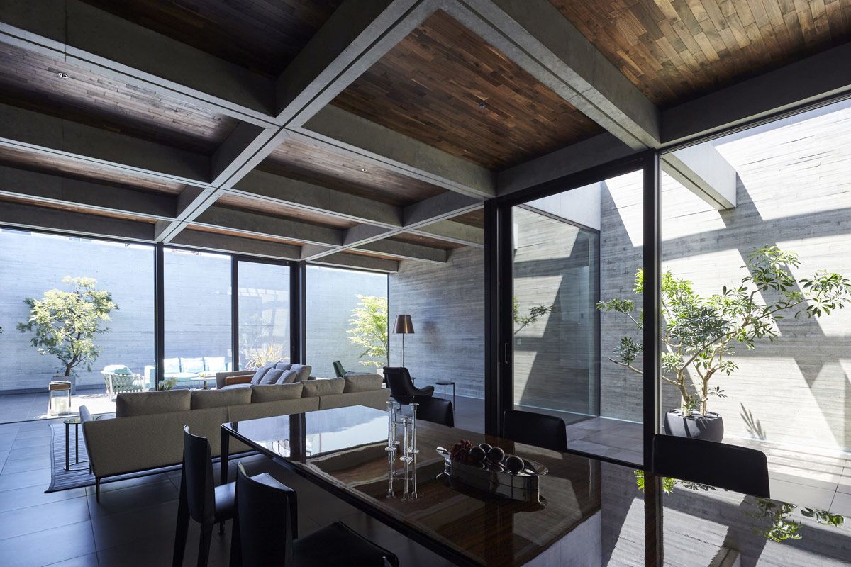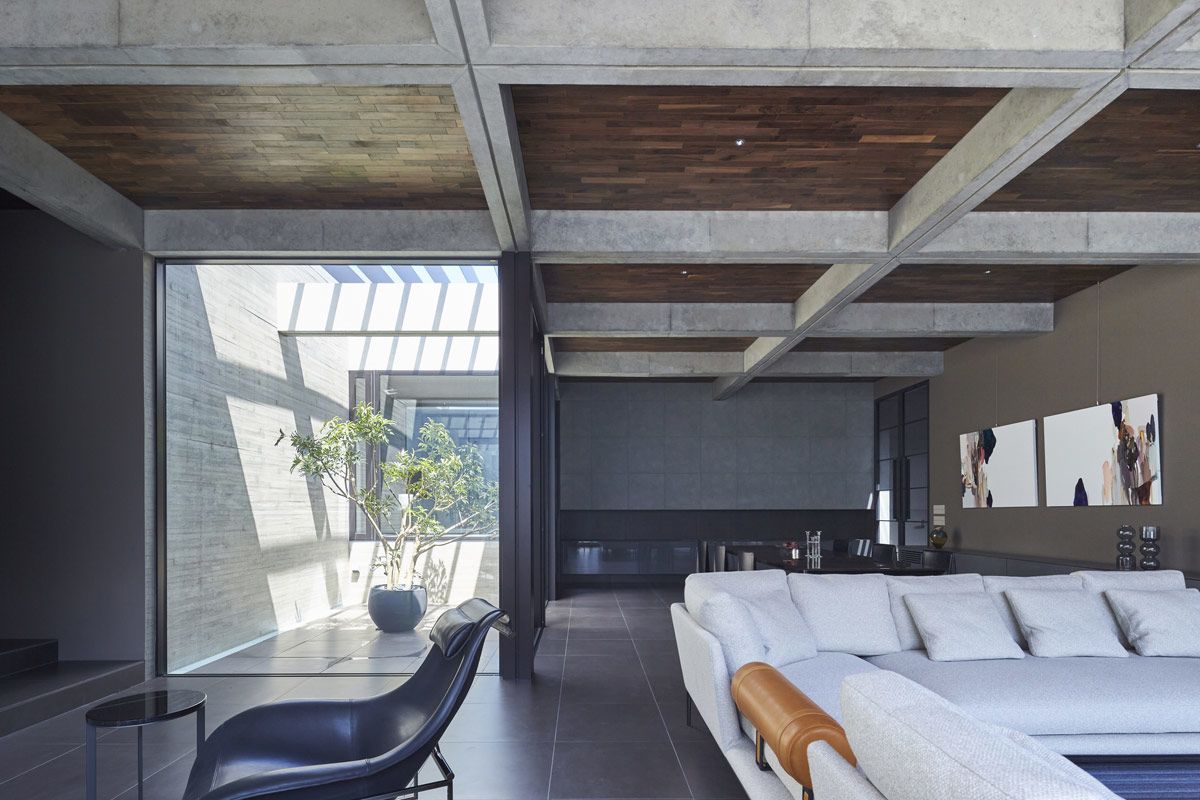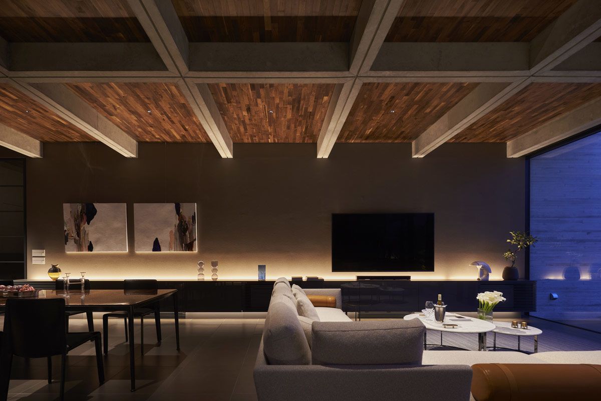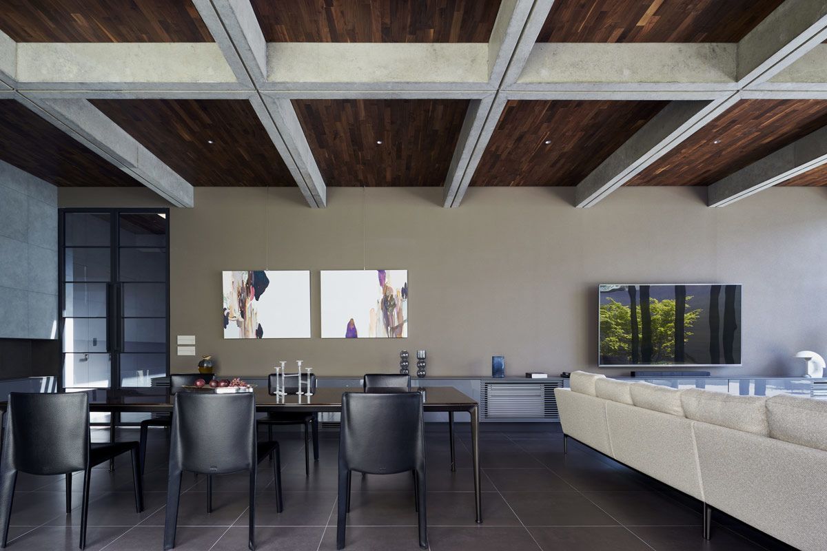 Inside the concrete living room, wood panelling warms up the coffered-ceiling, adding a contemporary ranch-style aesthetic to the space.