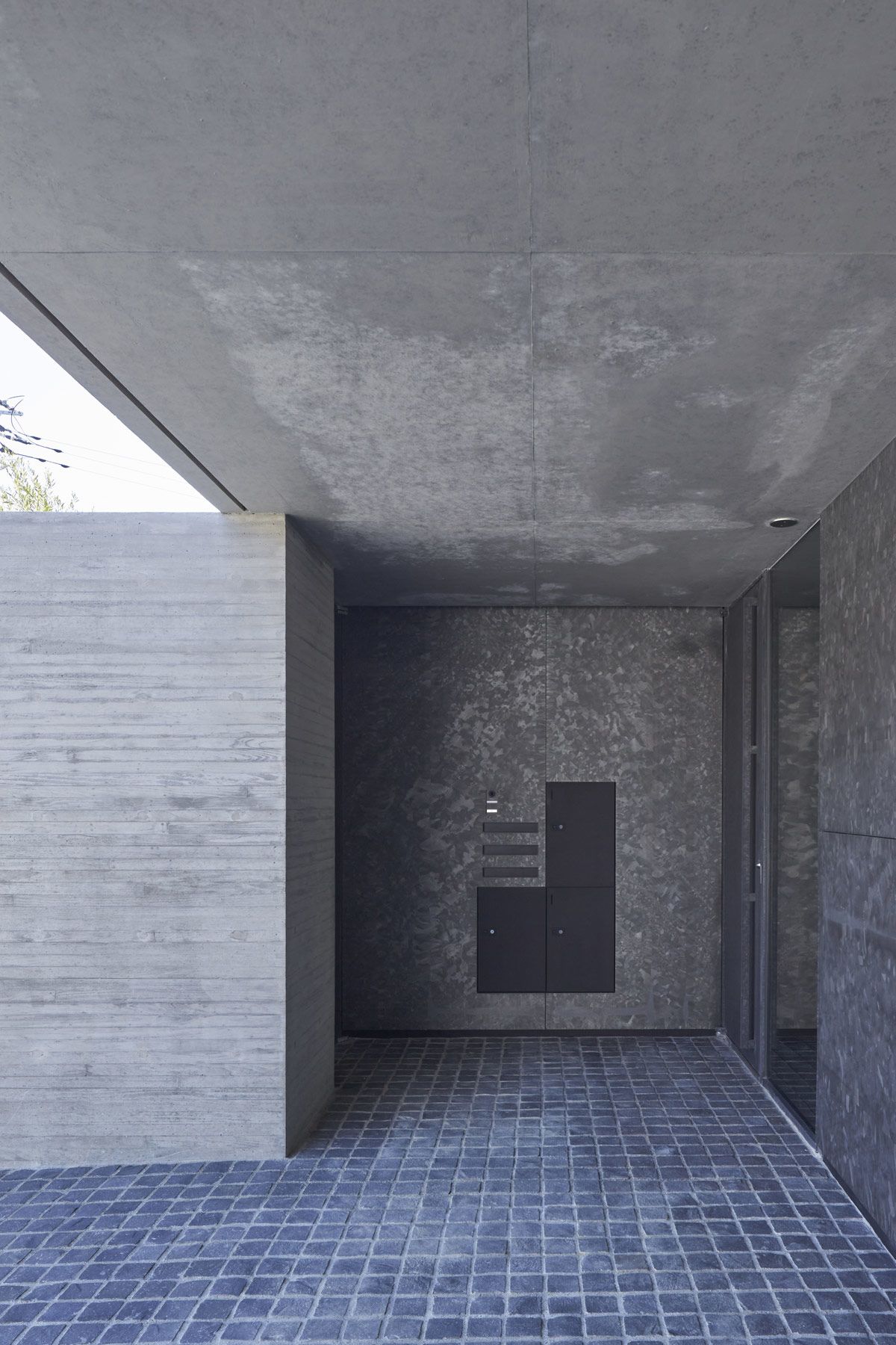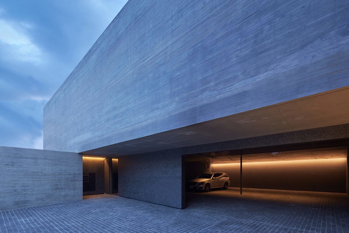 The driveway leads into a covered four car parking garage, situated underneath the main mass of the board-formed concrete house. With the property elevated from the road, the main living space is accessed via an elevator or stairs from the secure parking area.