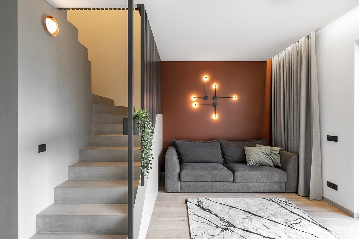 In interior design some types of materials are sometimes associated with specific styles. Concrete for example is a trademark of industrial decors but also suits really well a variety of modern and contemporary spaces. These stairs for instance don’t looks as rugged and as harsh as one might imagine, especially since they curve around the wall and have this beautiful decorative wall doubling as a railing. This is a space designed by Kristina Lastauskaitė-Pundė.