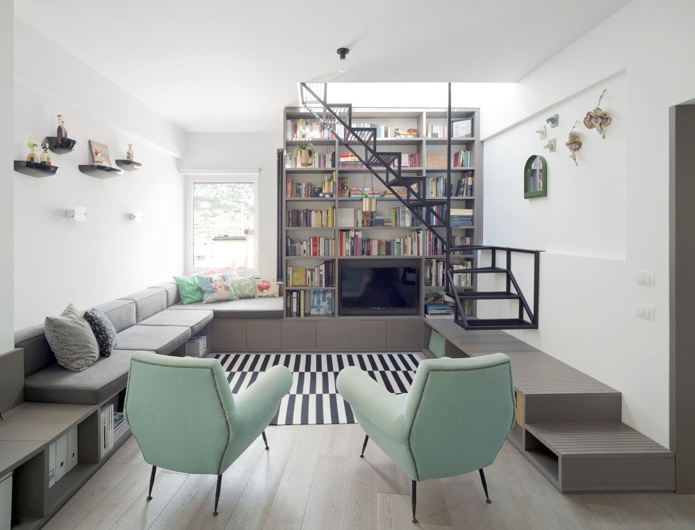 The design of this staircase is also unusual in the sense that it’s made from a rather unexpected material: iron. It also has a very graphical sort of look, like it’s been sketched out with only the outlines showing and gaps that are not filled in. The design is meant to look interesting but also to be space-conscious and to fit into this small living area without being in the way, visually or otherwise. It was all done by Gosplan architects.