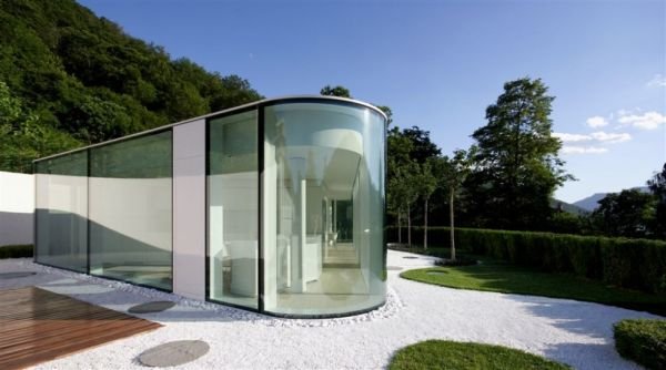 This house is not only in a beautiful country, but the home itself, is so unique that it is a glass house masterpiece. Designed by Italian architect, Jacopo Mascheroni, it is gently curved and is a polygonal shaped glass house that sits on a sloped hill in Lac Lugano in Switzerland. The home was designed on two levels due to the topography at the site. On the upper level you will find the living and dining rooms, thee kitchen, as well as storage spaces. On the lower levels, you’ll find the bedrooms, bathrooms and garage. There are two separate views you get from the home, including the view of the mountain, while the second view is that of the garden that overlooks the lake. No matter where you look out of the home, there is a gorgeous, unobstructed view through the glass windows that give you endless amounts of natural light throughout the home. This house is a beautiful example of modern glass homes.