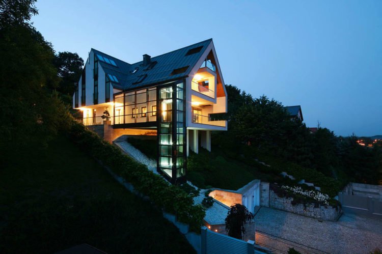 This gorgeous glass house sits high on a steep slope, rising up higher by the support of four columns that support not only the home itself, but the terrace that extends. It is situated in the town of Krakow, Poland and is a design by architect Tadeusz Lemanski. Not only is this an innovative design, but there are some very unique features that were included in the home, including a vertical glass tunnel, built to house an elevator to connect the levels, both the private and social entities of the home. It also has an underground garage that is not accessible by the tunnel, as the tunnel discreetly disappears into the landscape. You can enter into the home through an unobtrusive door next to the garage which will lead you to the tunnel, or you may choose to enter through the door that leads to the main living and social areas. The GG House is not only one of the most beautiful glass houses, but one of the most unique.