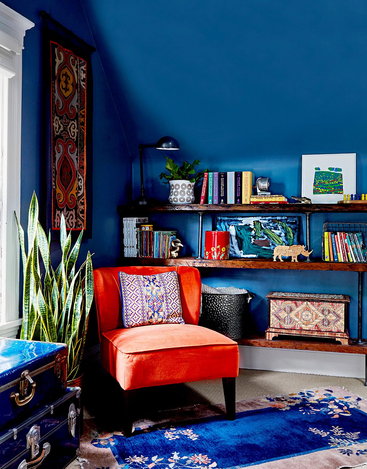Using two hues directly opposite each other on the color wheel, such as blue and orange, is guaranteed to add energy to any room. These complementary colors work well together because they balance each other visually. You can experiment with various shades and tints of these complementing color wedges that find a scheme that appeals to you. In this living room, for example, a bright shade of orange offers warmth and brightness that balances a deep cobalt blue. The key is to not let one color overtake the other. As the wall color, blue appears more prominently, while the orange serves as an accent. The two colors appear on other elements throughout the space for a cohesive look.