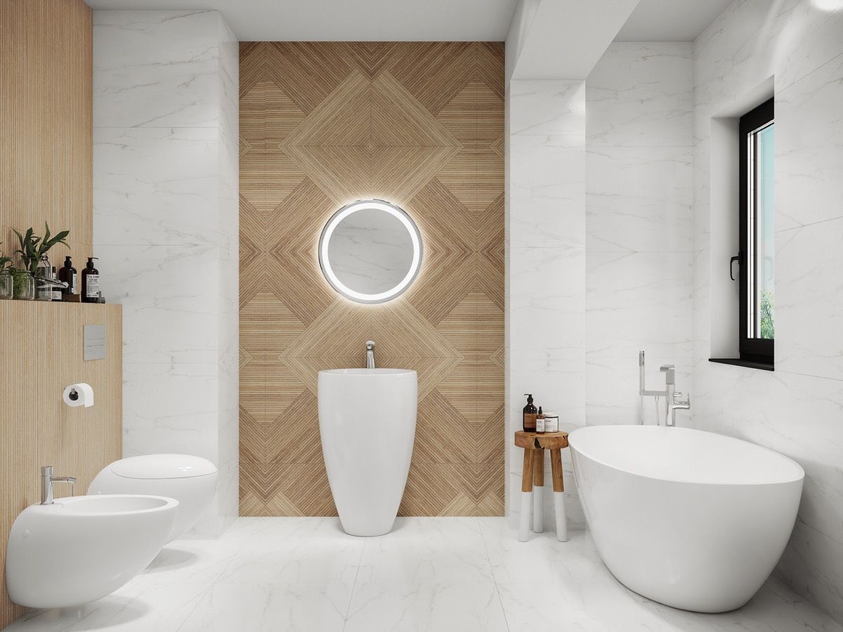 Wonderful wood. The first shot at this bathroom space is a design centered around a stunning wood panelled feature wall, where the grain is set in geometric pattern. An elegant modern pedestal sink is poised in front. The remainder of the bathroom is kept mostly white to allow the special feature wall to hold its spotlight.