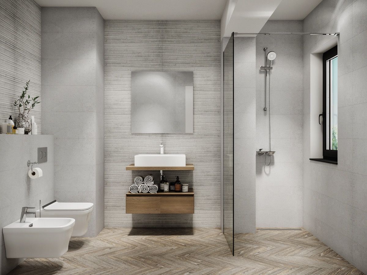Low colour, high texture. Herringbone floor, ribbed feature walls and concrete tile fill this bathroom with subdued colour, yet their texture gives the eye plenty to work on.
