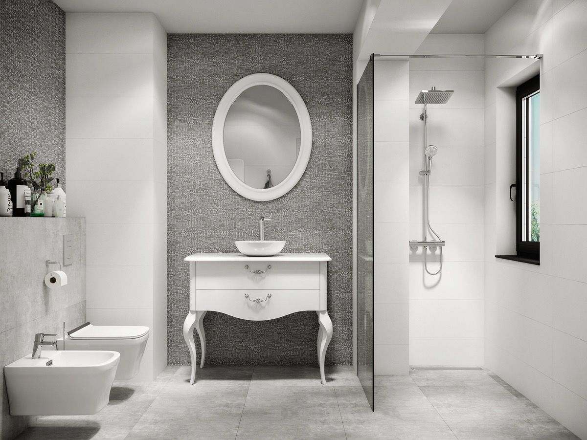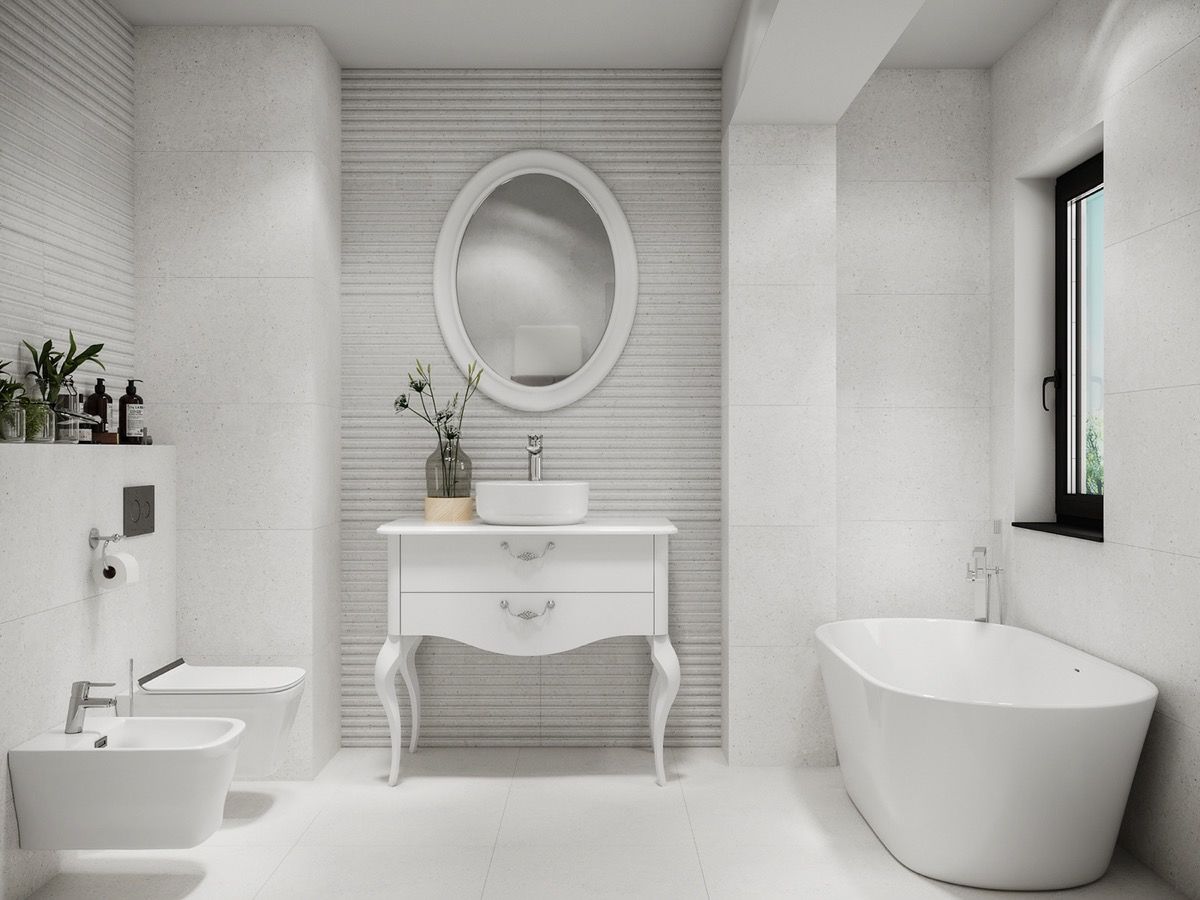 We’re looking at alternatives for every aspect here: complete changes in colour scheme, alternative wall treatments, different styles of bathroom furniture and new vanity mirrors. Each change brings about a different ambience in the room, a different personality. Which style would you go for, if you could do it all over again?