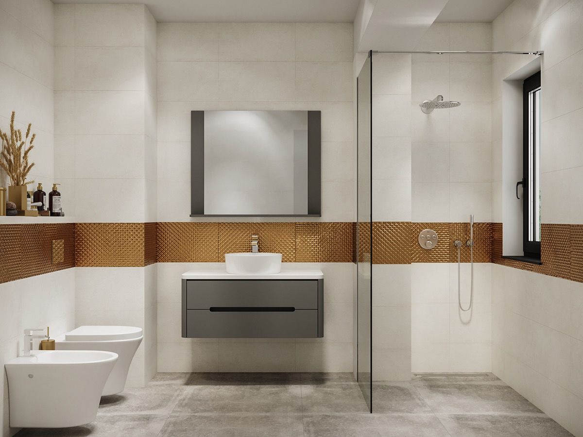 Get up and go-ld. Feel special in the mornings by wrapping yourself in gold. A strip of golden tile wraps this white bathroom design, like ribbon tied around a precious gift.