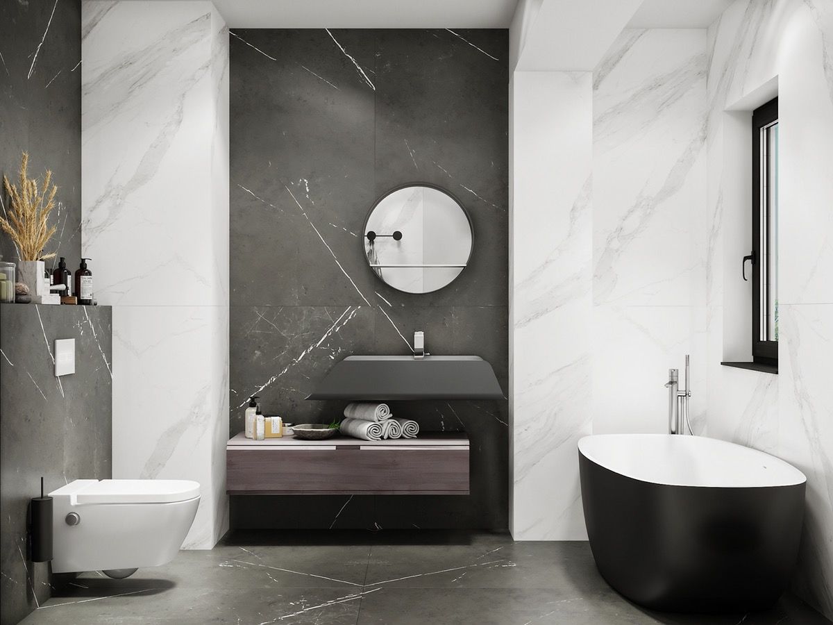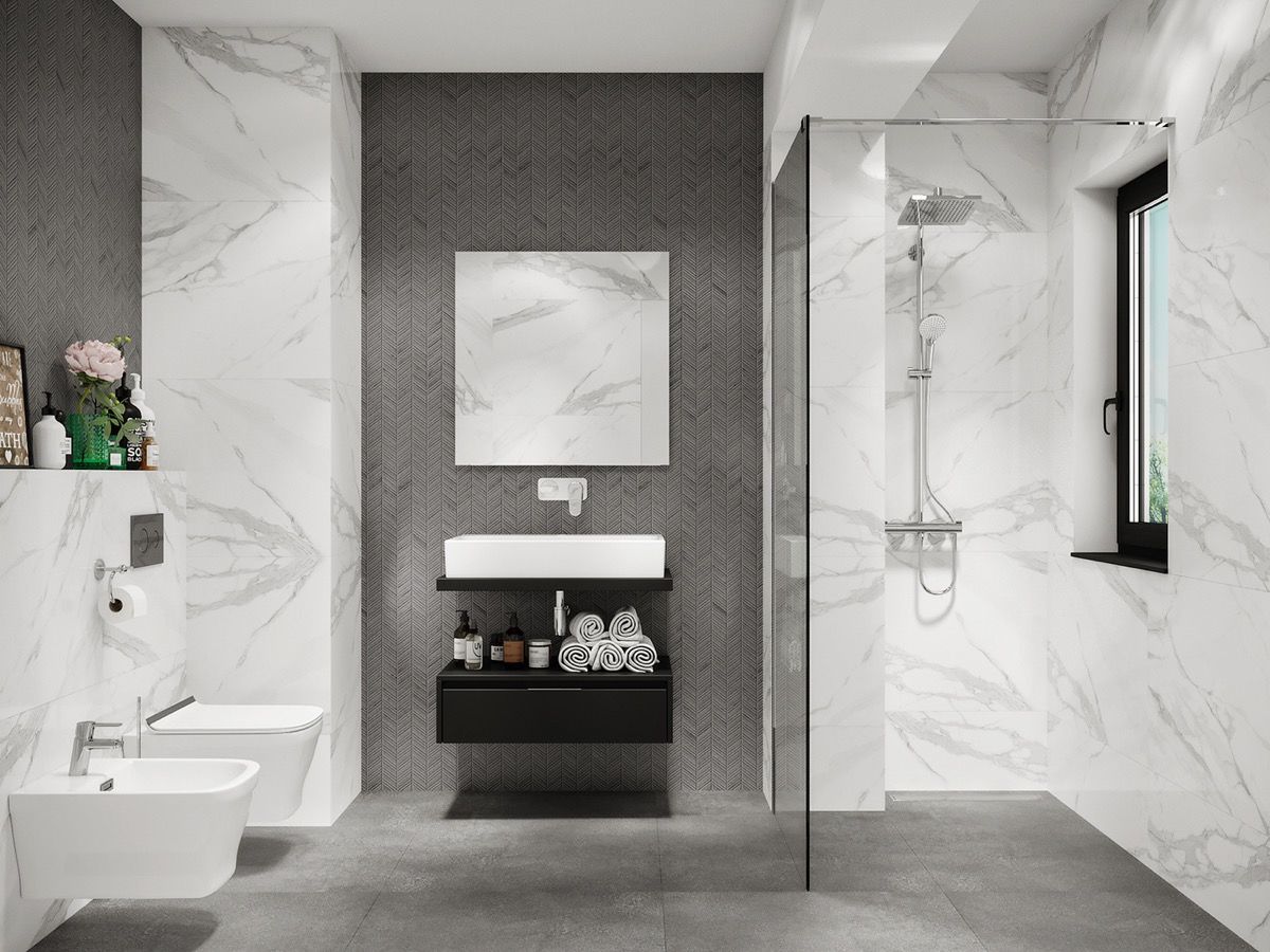 Look for luxe finishes.This grey and white bathroom looks glorious in swathes of marble and high-end geometric tile. Even the smallest of spaces can look the business given the right materials.