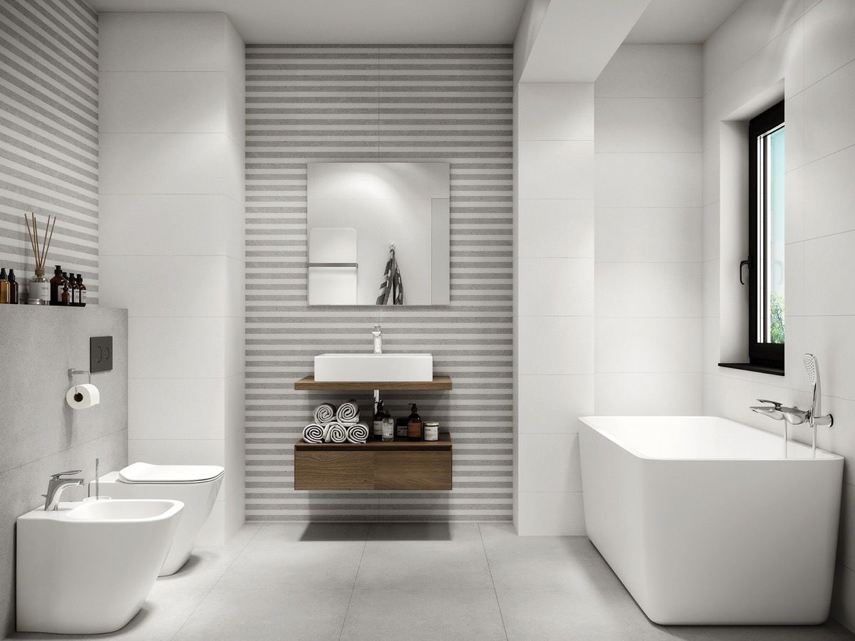 Smart and stripey. Zhuzh up a modern bathroom scheme with grey and white stripes, then warm through with wooden accent pieces.