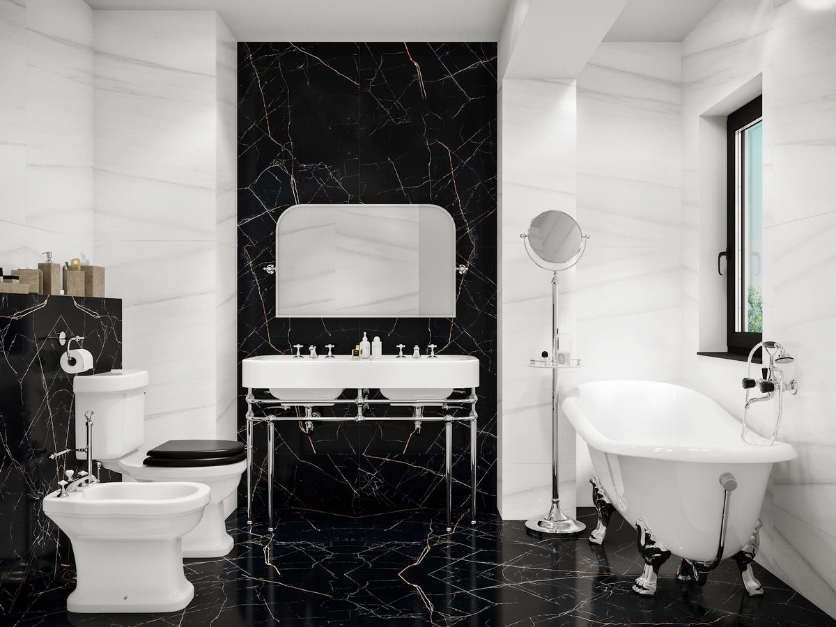 Black marble and chrome. Black marble and traditionally styled sanitaryware shape this luxury bathroom design. A roll-top bath stands on chrome clawed feet, and shining towel rails surround the double sink vanity.