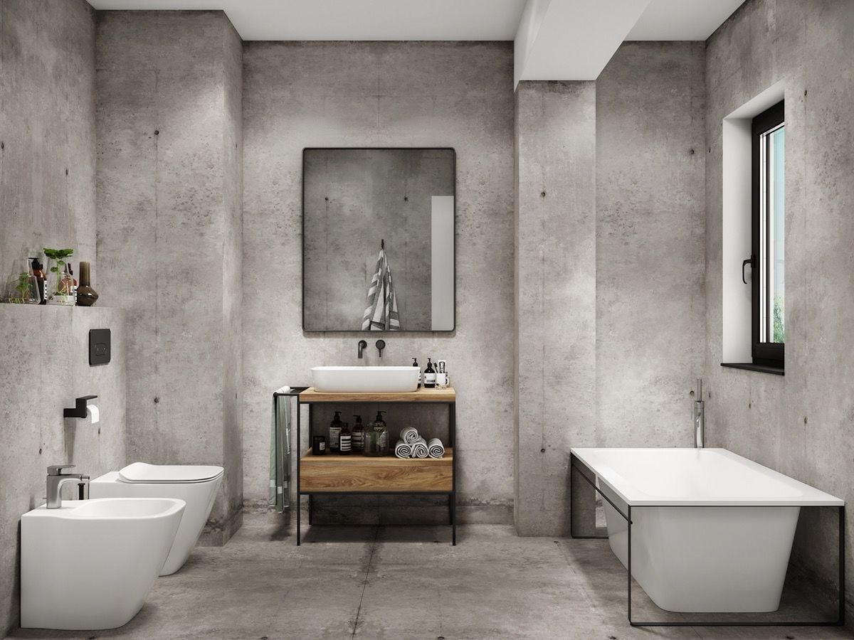Raw concrete and ravishing furniture. An industrial bathroom is one for the trend setter. We see a return of the extraordinary wireframed bathtub design here, and a complementary wireframed vanity unit. The introduction of wood on the vanity is an important move, as it supplies the only visual warmth in the room.