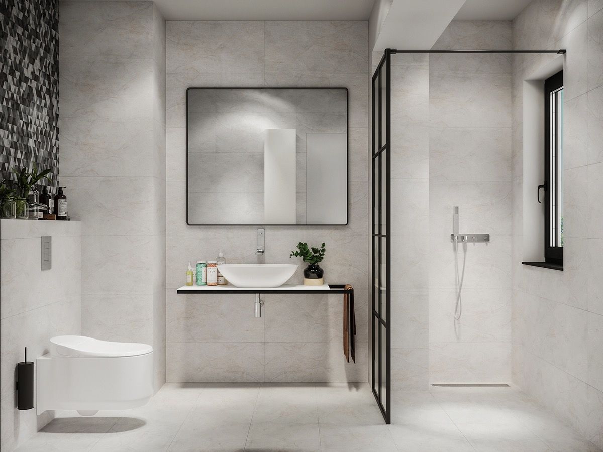 There’s beauty in balance. Attention-grabbing tiles have been restricted to the cistern wall in this one, to balance out a chic black framed shower screen.