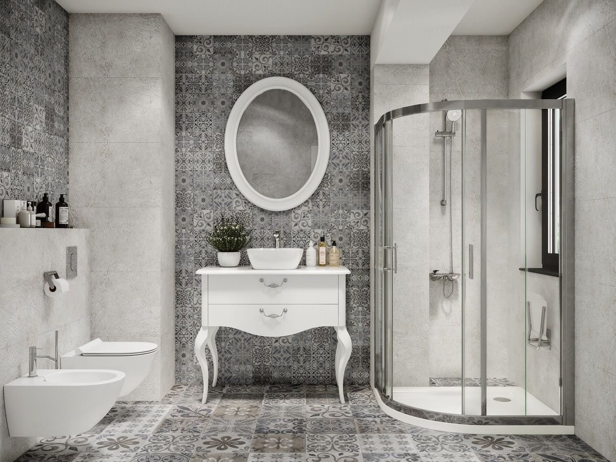 Pattern for miles. Stylish, characterful and so en vogue, patterned tiles can turn a bland bathroom scheme into something super special. We see the introduction of a corner shower in this design too, curving away to leave a larger floor area, and even more sublime pattern. The shower tray will not fit back into the recess, so a small tiled step fills in the gap.