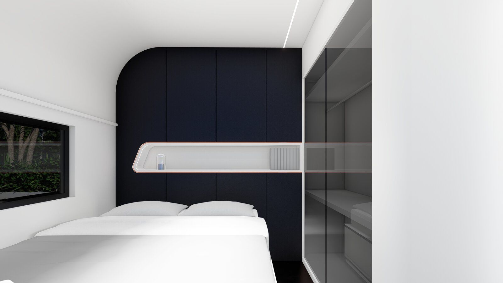 Curved edges and voice-controlled tech lend a futuristic feel to the home, which is designed so that it can be shipped anywhere in the world and arrive move-in ready. "The home is fully equipped with built-in furniture that helps to maximize floor space," Law says. "There’s no installation needed upon arrival. Much like how a washing machine works, our clients just need local contractors to wind up the power sockets and the water supply and then Cube Two X is a fully functioning home."