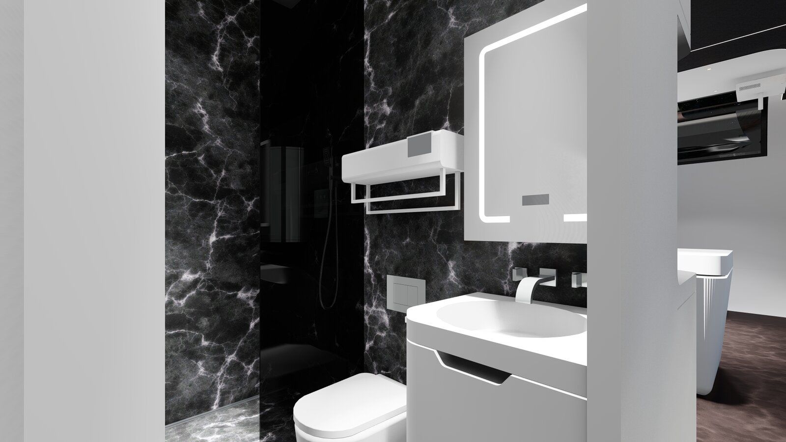 Optional features include electric-heated flooring, a smart mirror, a music system, and a concealed electric stove. "The invisible stove is a unique space-saving idea," Law says. "It’s a seamless kitchen counter when you’re not cooking, but when you are, the counter transforms into a stovetop."