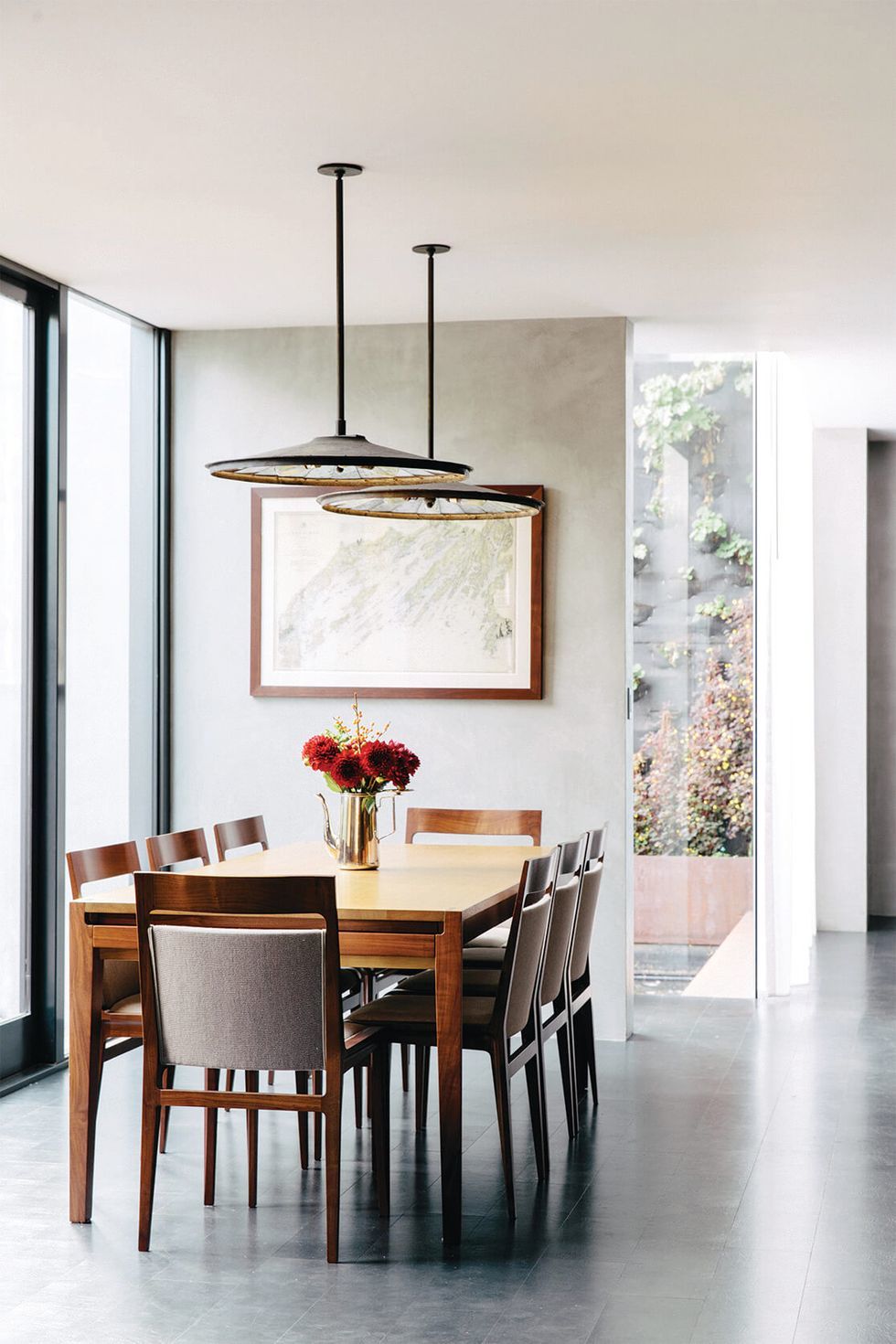 Brushed concrete walls mimic the polished concrete flooring in this contemporary dining room by Catherine Kwong Design. The wood tones establish a timeless warmth that complements and contrasts with the edgy concrete surfaces beautifully. Using chalk paint or a super flat finish can also help you accomplish this look even if you don't have concrete walls.