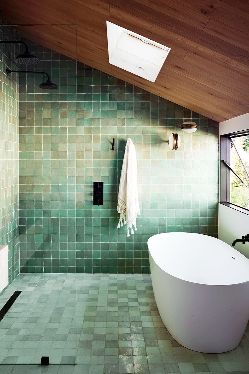 The color variations of zellige tiles make them a sure-fire way to create a lived-in, unique, and earthy atmosphere. They're particularly well-suited for bathrooms, like this one by Romanek Design Studio, since they're water-resistant and also create a spacious illusion when extending from the floor up to the ceiling.