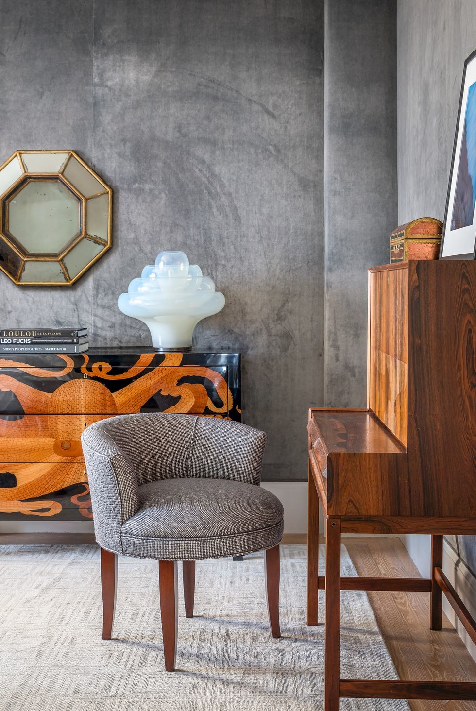 Velvet upholstered walls create an undeniable sense of luxury and elegance to this room by Alison Pickart Design. She padded the walls too, which dampens sound and makes the room feel extra intimate, like a world of its own.
